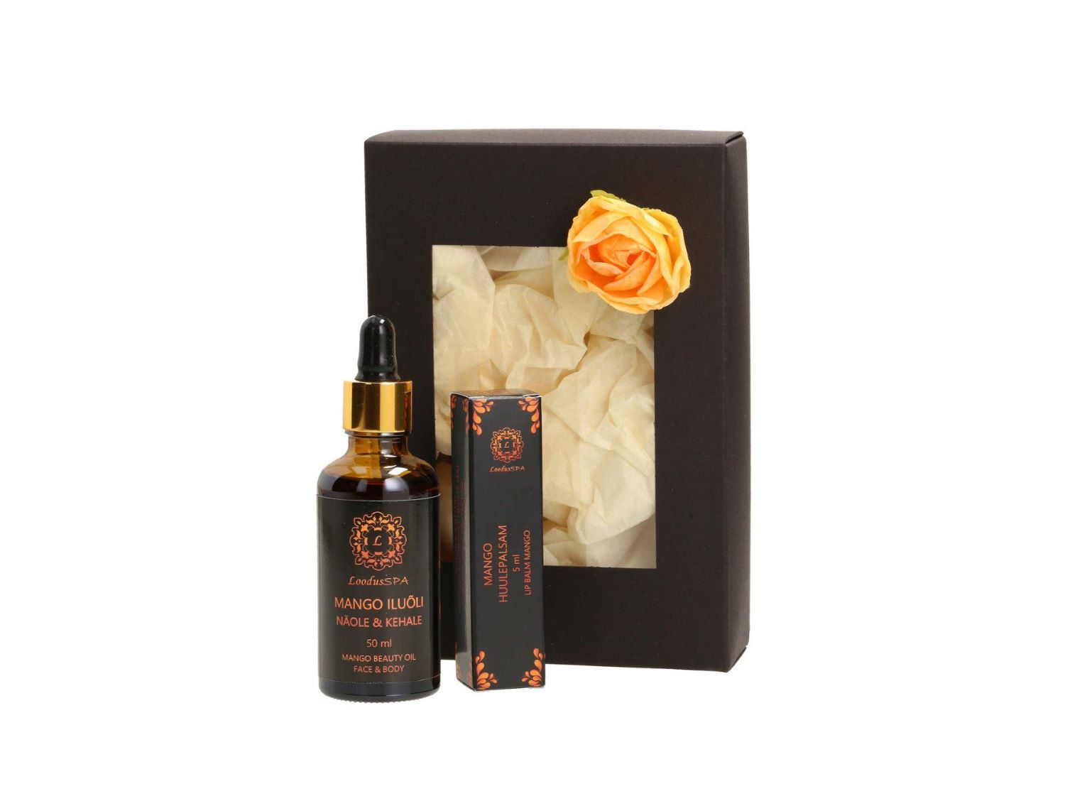Kinkekomplekt sisaldab: Mango iluõli 50ml + Mango huulepalsam 5ml.