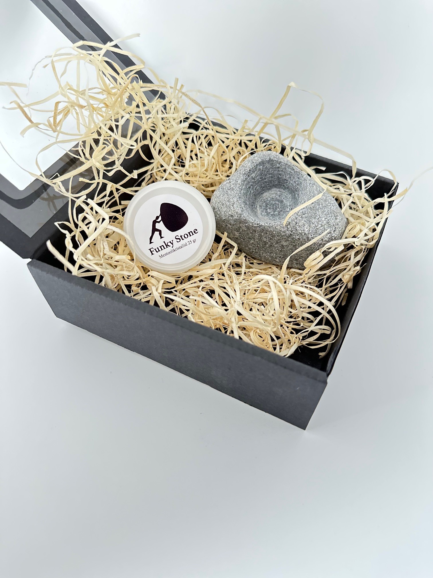 Komplekti kuulub käsitööna valminud naturaalsest kivist aroominõu ja 25grammine pakk mündiga saunakristalle.