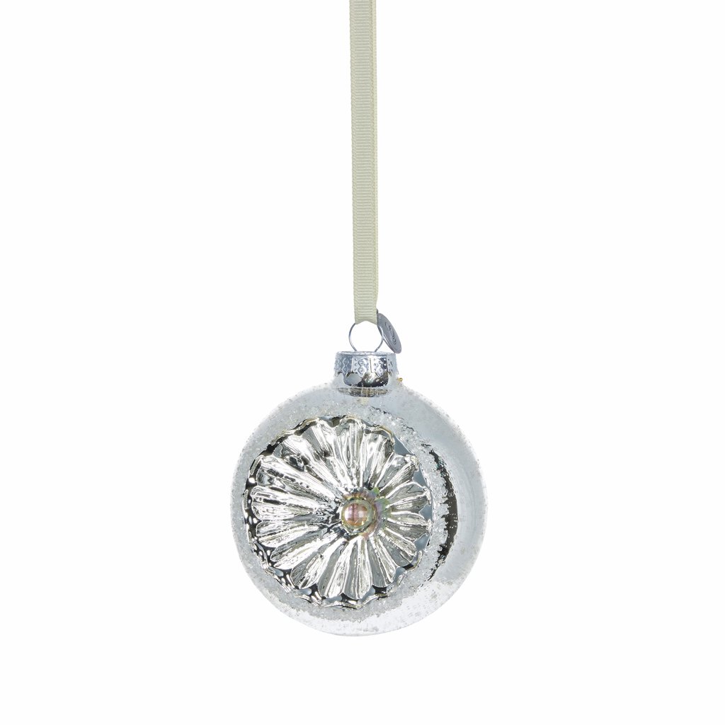 Hevig klaaskuul hõbedases toonis toob jõulukaunistustesse klassikalist sära ja nostalgilist pehmust. Vintage-stiilis disain, jäätunud efektiga pind ja detailne süvendatud keskosa loovad ajatu ilme, mis peegeldab valgust kui elavhõbeklaas ning lisab igale kuusele külma sädelusega pidulikkust.