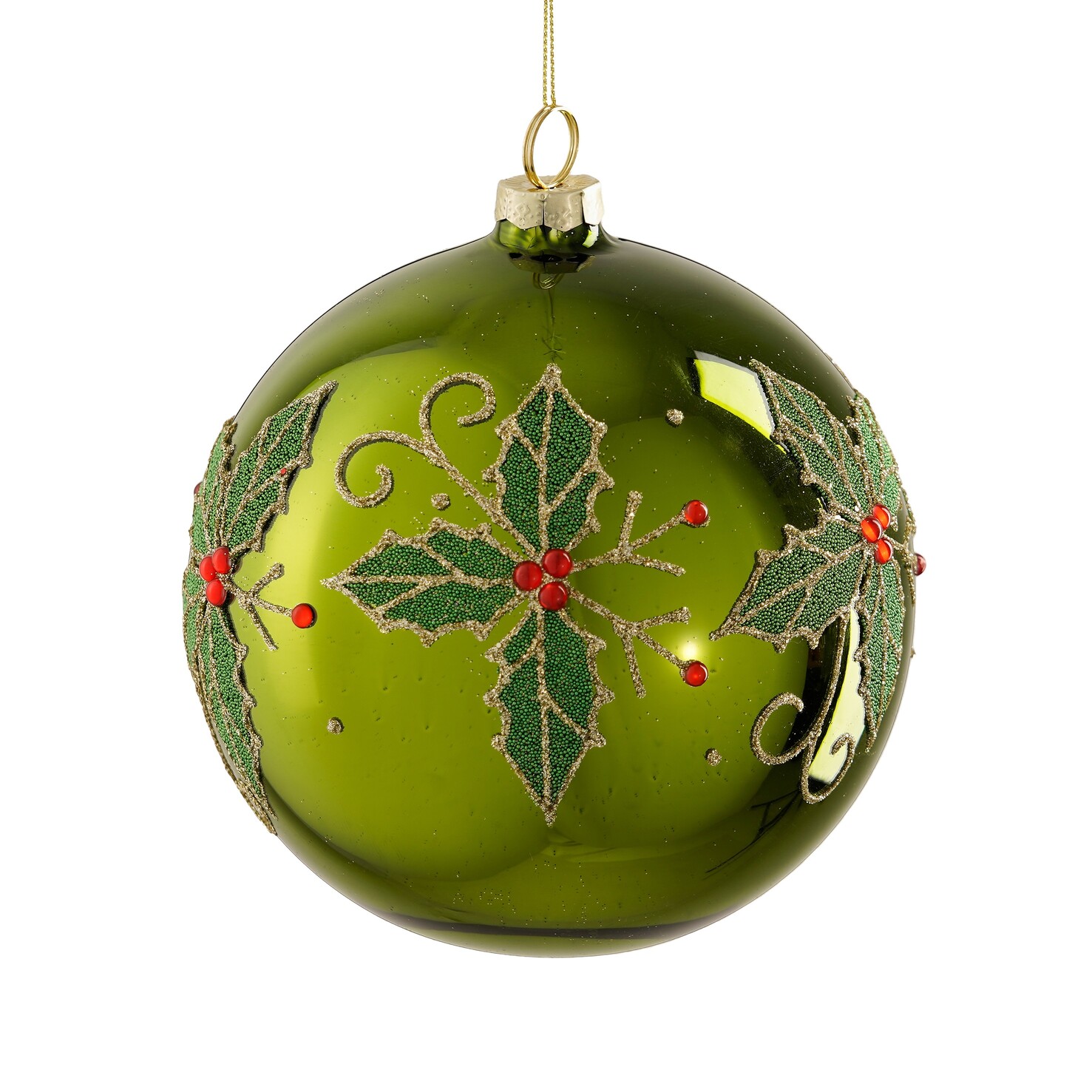 Klassikaline klaaskuul, mis lisab kuusele värskust ja traditsioonilist hõngu. Roheline läikiv pind on kaunistatud iileksi lehtede ja sädelevate detailidega, millele annavad aktsenti väikesed punased marjad. Suurem läbimõõt teeb kaunistuse silmapaistvaks nii kuusel kui ka muudes dekoratsioonides.