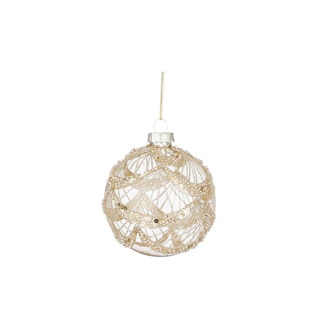Naiselik klaaskuul, mis lisab kuusele luksuslikku sära. Läbipaistev pind on kaunistatud kuldsete pitsimustrite ja pärldetailidega, mis loovad peene ja romantilise üldilme. Sobib suurepäraselt kombineerimiseks teiste kuldsete või heledates toonides kaunistustega.