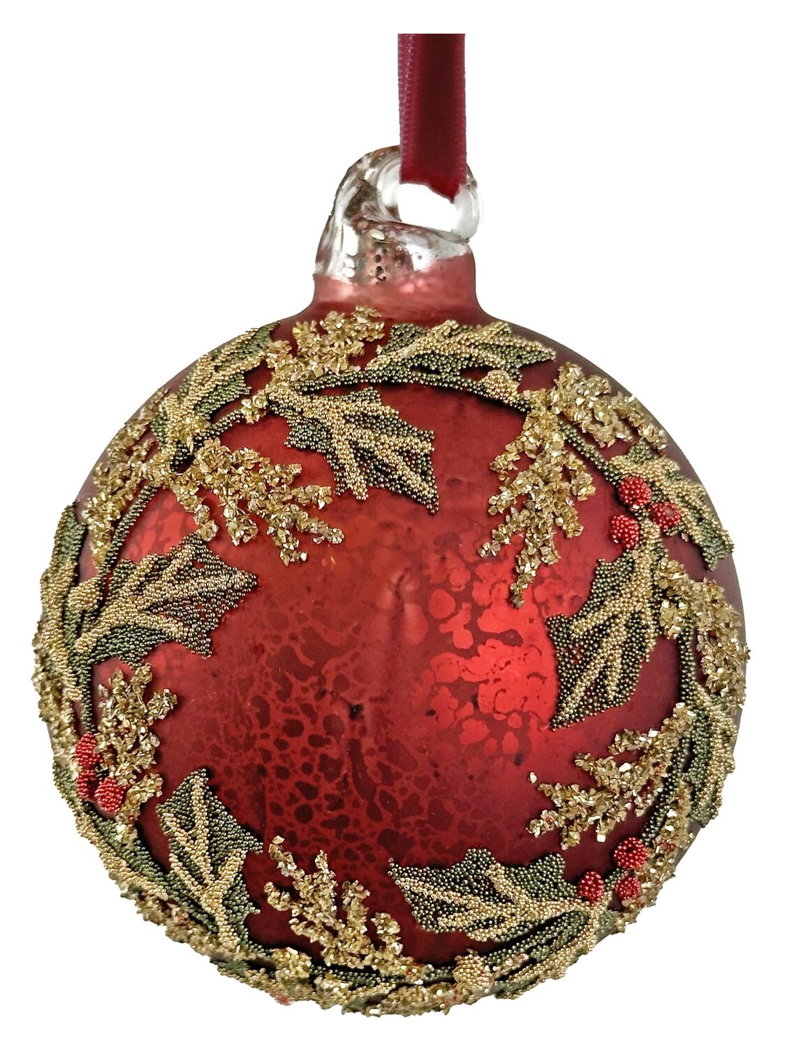Punase taustaga klaaskuul, mille pinda katavad rikkalikult vormitud iileksi lehed ja marjad. Kuldsed ja tumerohelised helmestest mustrid loovad ehtesse jõululiku tunnetuse, samas kui punased detailid toovad kujundusele elavust. Kuuli kergelt marmorjas viimistlus lisab sügavust ja muudab selle sobivaks nii traditsioonilisse kui ka modernsesse kaunistusstiili.