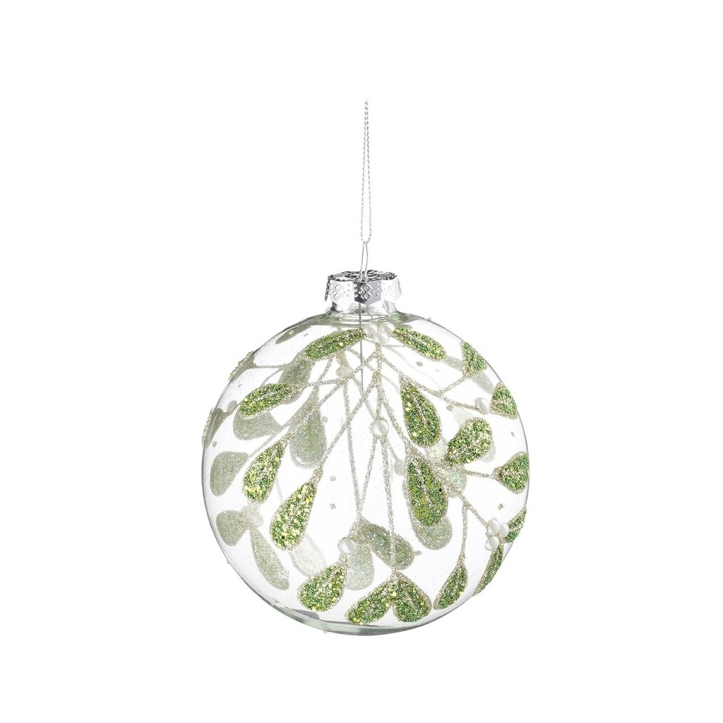 Õhuline klaaskuul, mis lisab kuusele kergust ja sära. Läbipaistev pind on kaunistatud roheliste lehtede ja peente sädelevate detailidega, mis loovad värske ja helge üldilme. Sobib hästi kombineerimiseks valgete, hõbedaste ja looduslähedaste toonidega kaunistustes.