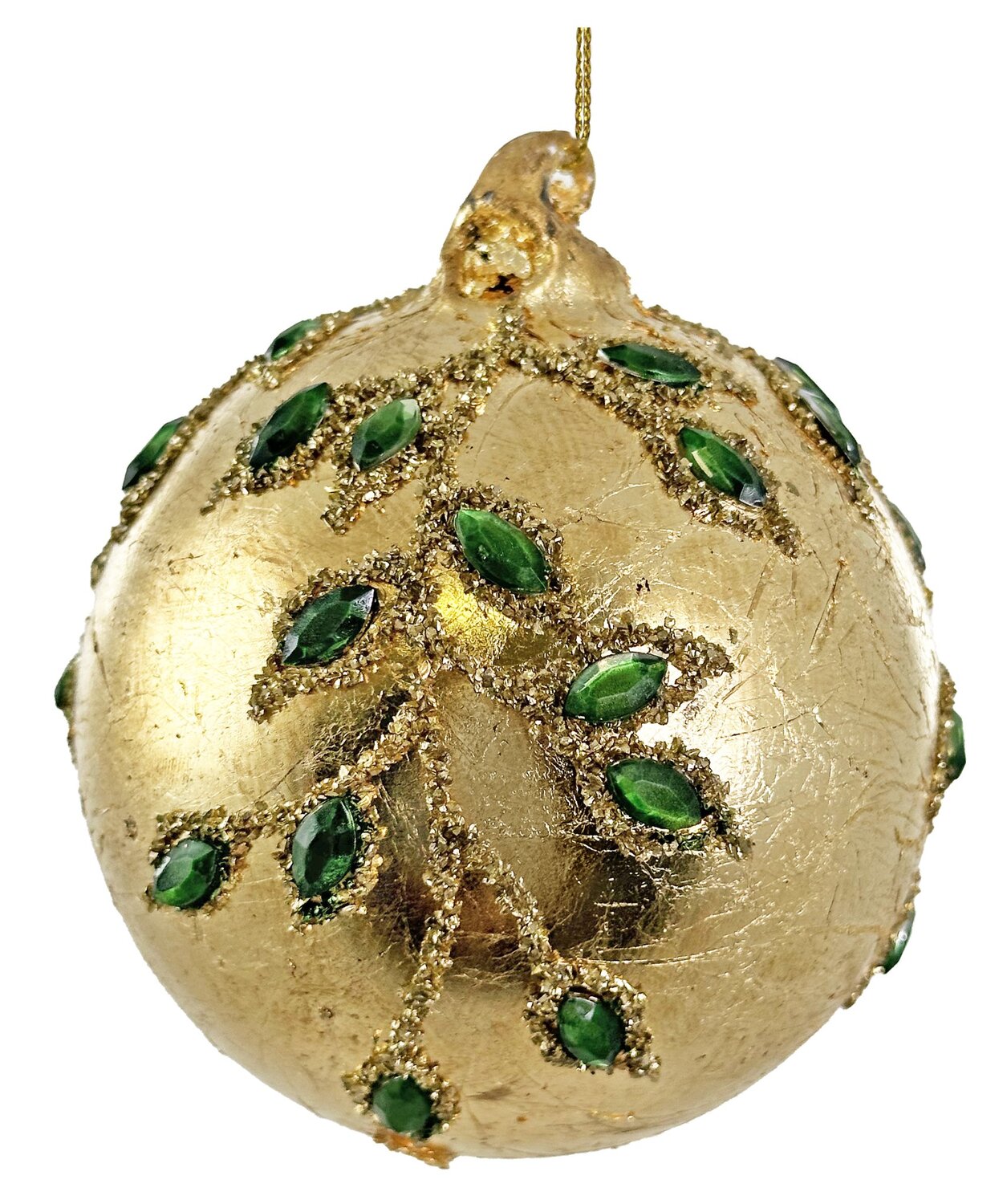 Klaaskuul, mille kuldne pind on kaunistatud filigraanse oksamustriga ja roheliste kivikestega, mis meenutavad väikeseid lehti. Oksjooned on kaetud sädeleva reljeefiga, mis rõhutab mustri voolavust ja loob valguses särava tekstuuri. Kergelt ebaühtlane kuldfooliumitaoline viimistlus lisab ehtesse antiikset hõngu.
