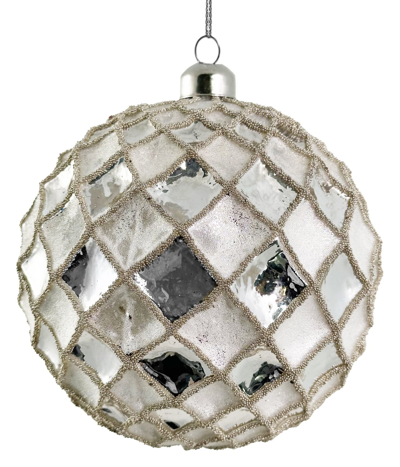 Suur hõbedane klaaskuul, millel vahelduvad matt- ja peegelpinnad moodustavad rütmilise rombimustri. Iga kujund on ääristatud peente helmestega, mis lisavad struktuuri ja annavad kogu kuulile viimistletud ilme. Läikiv ja matt viimistlus loovad huvitava valgusemängu, mis toob esile kaunistuse mitmekihilise iseloomu.