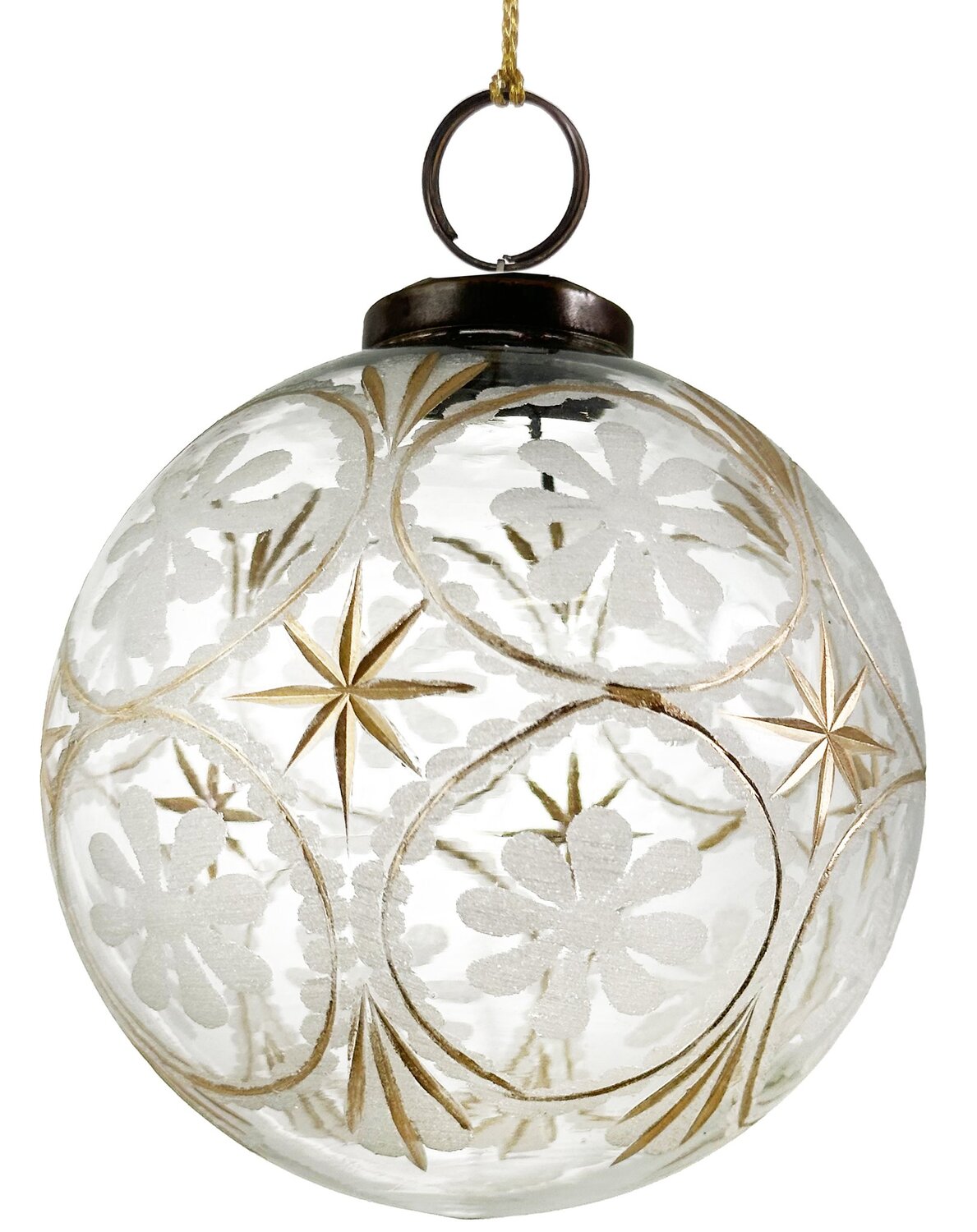 Õrn ja läbipaistev klaaskuul, millele on joonistatud mattvalged lilled ja kuldsed tähekesed. Lillemotiivid paiknevad sümmeetriliselt ringikujulistes raamistustes, tuues esile klassikalise mustri. Läbikumav pind laseb valgusel läbi mängida, muutes ehte õhuliseks ja valgust peegeldavaks kauniks detailiks.