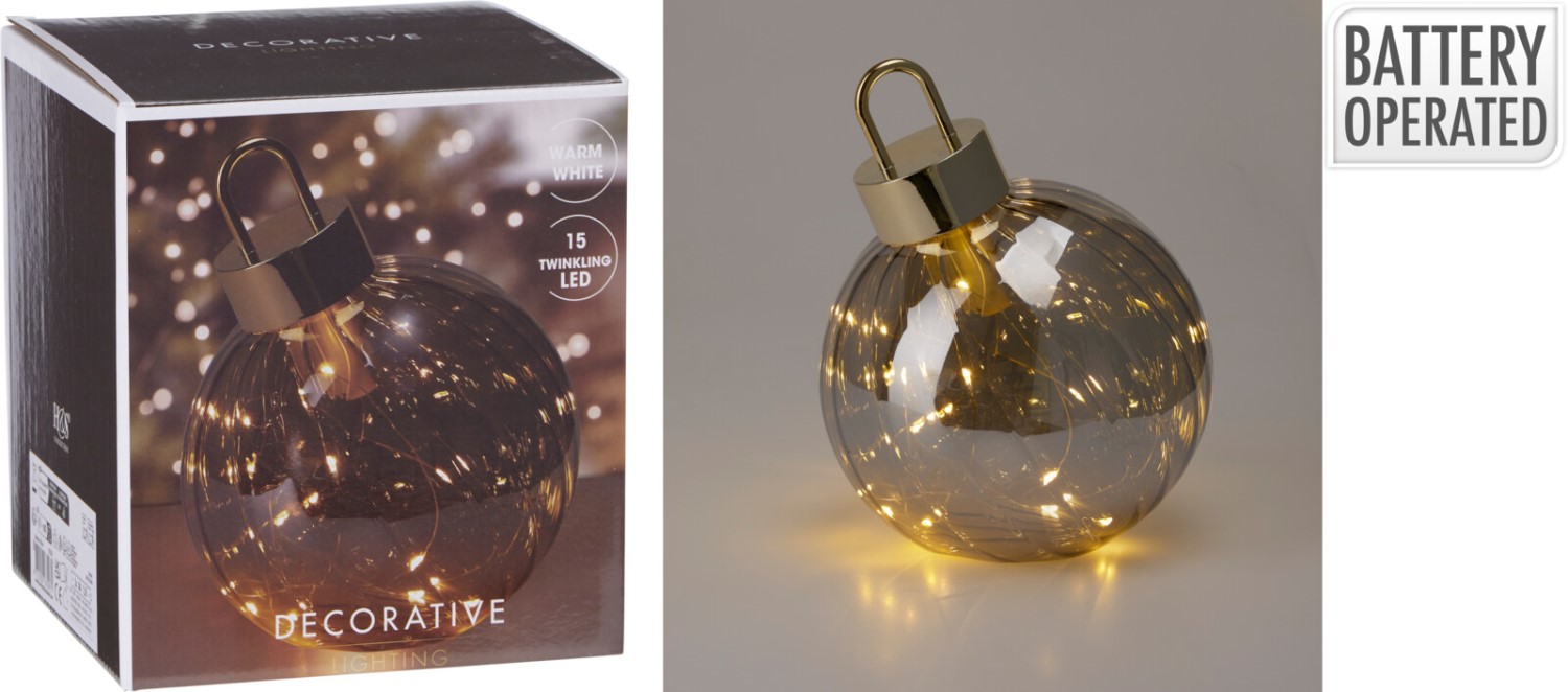 Läbipaistvast suitsuhallist klaasist dekoratiivkuul, mille sees helklevad 15 sooja valgusega LED-tuld. Õrnalt virvendav valgus loob õdusa meeleolu ning kuldne kinnitusdetail lisab modernset sära. Sobib hästi aknalauale, riiulile või kinkimiseks – efektne detail, mis ei vaja palju, et mõjule pääseda.