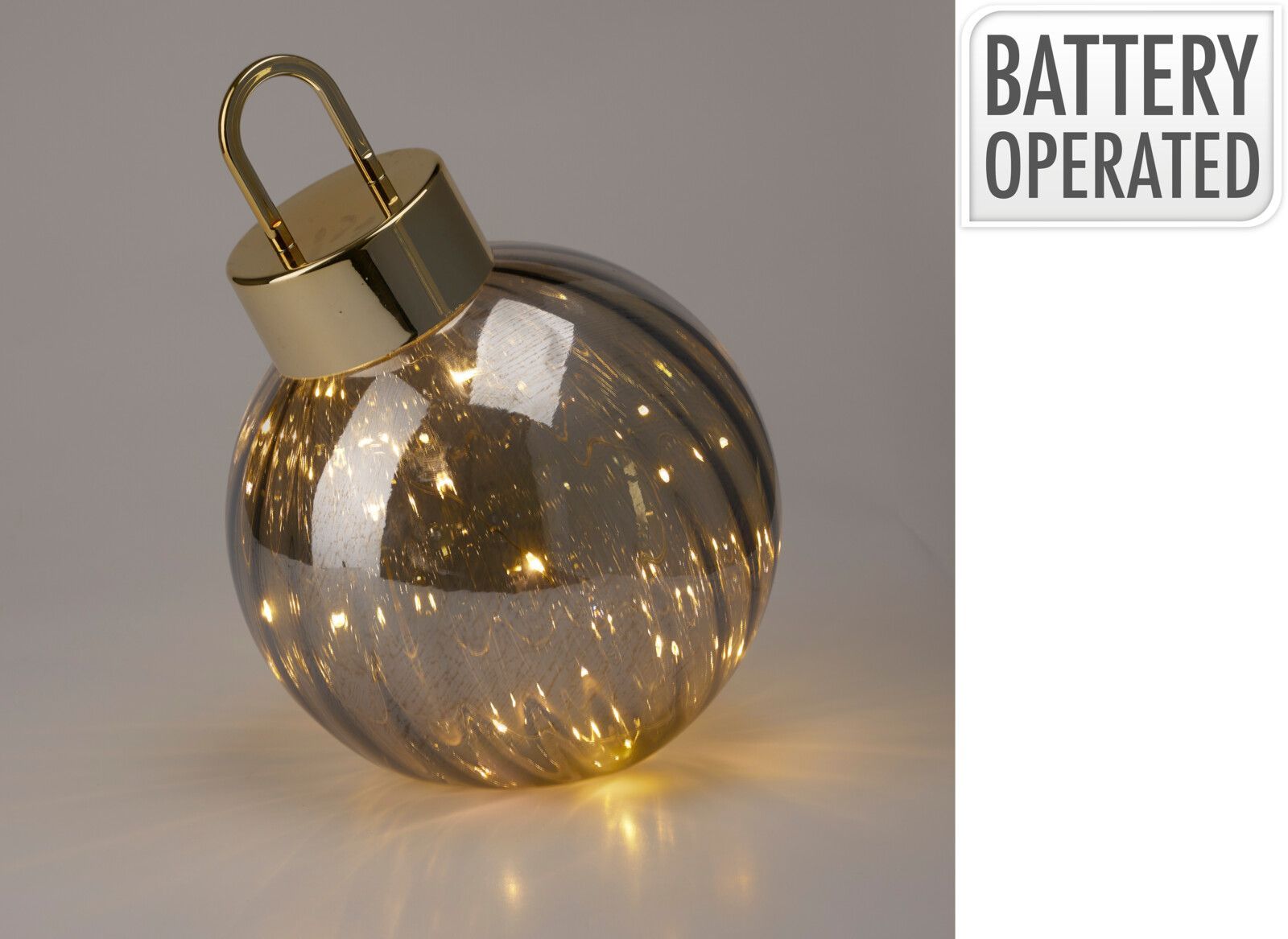 Lummava suitsuhalli klaasviimistlusega dekoratiivkuul, mille sees sädeleb 20 sooja valgusega LED-tulukest. Kerge valgusemäng läbi toonitud klaasi loob sumeda meeleolu ning toob esile metalse korgi modernse sära.