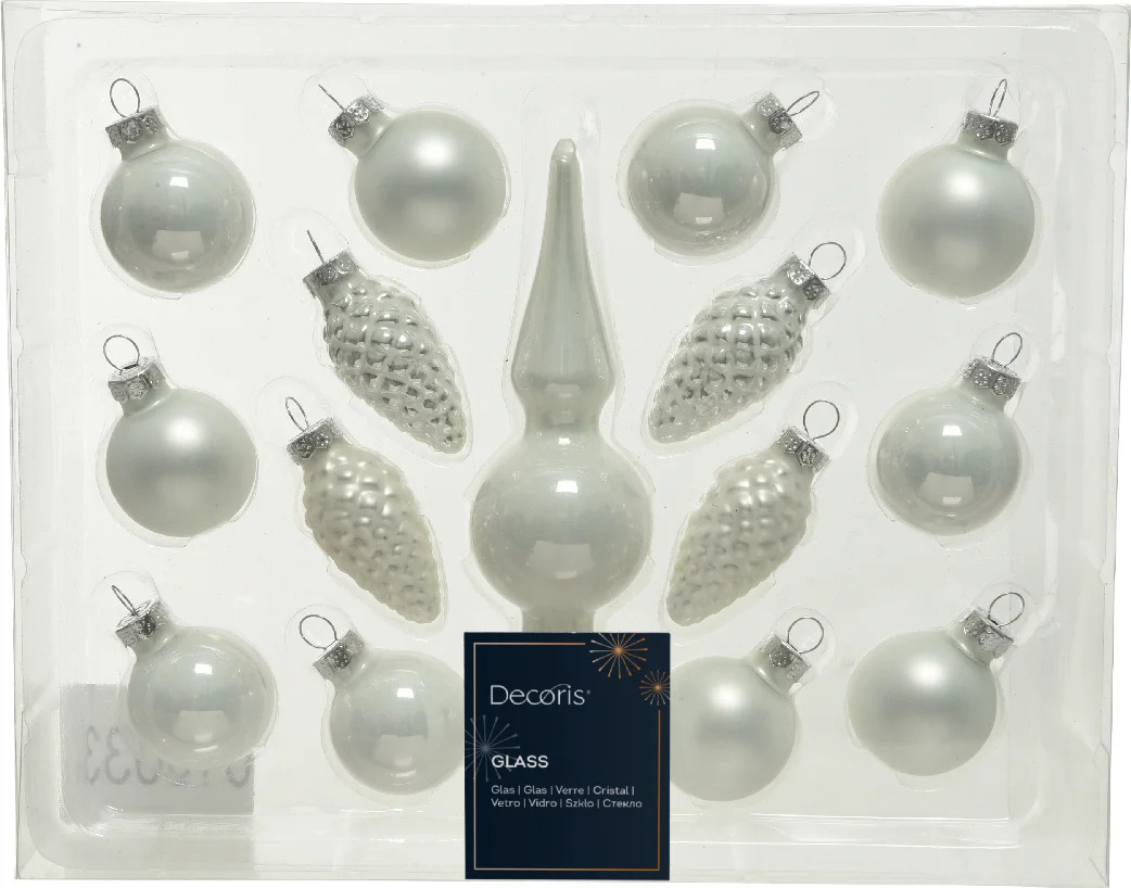 Klaaskuulide komplekt + kuusetipp matt/läikiv valge Ø3,5cm 15tk/pk