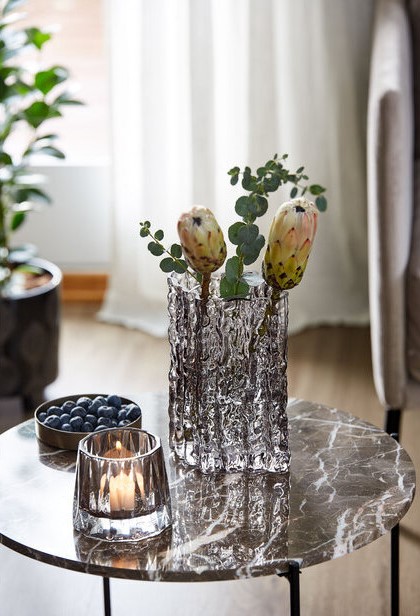 Reljeefse ja voolava pinnastruktuuriga klaasvaas Icey loob valguse käes mängleva ja sügava visuaalse efekti. Hall toon lisab vaasile iseloomu ning sobitub hästi modernsesse ja minimalistlikku interjööri. Ebakorrapärane serv ja skulptuurne vorm annavad vaasile kunstilise ilme, mistõttu toimib see hästi ka ilma lilledeta dekoratiivelemendina.