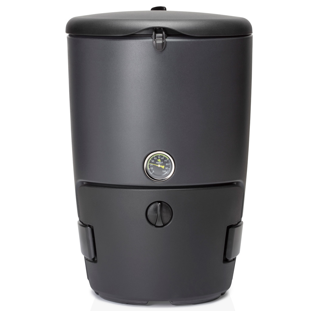 Kvaliteetne, uuendatud soojusisolatsiooniga kodukomposter Kekkilä Kodukomposter 230 L Kestlik+ on kvaliteetne ja kahjurikindel termokomposter, mis vastab jäätme-eeskirja nõuetele. Kodukomposter on puhta disainiga ja ümmargune kuju jaotab soojuse ühtlaselt aastaringseks kompostimiseks. Kodukomposter on ergonoomiline. Tänu suurele kaanele ja tühjendusluugile, on seda lihtne täita ja tühjendada. Toode on valmistatud ringlusse võetud plastist (PE) ja sellel on kõige paksem soojusisolatsioon (PS) turul. Ümberkujundatud disain: Kõvast plastist termokate ja suur tühjendusluuk, tõhus kahe ventiiliga ventilatsioon, kaane lukustusriiv ja tugihing hõlbustavad kompostri kasutamist ja tagavad õhukindla konstruktsiooni. UV-kaitsega raam ja selle sees olev paks isolatsioon muudavad toote funktsionaalseks ja kauakestvaks. Kaanel ja tühjendusluugil on mõlemal ventilatsioon. Tänu põhja kallutamisele suunatakse vedelikud kompostrist välja ühe filtri kaudu. Anname Kodukompostrile 25-aastase raamigarantii – ärge unustage toodet registreerida. Materjal: ringlusse võetud plast (PE), plast (PE + EPS)