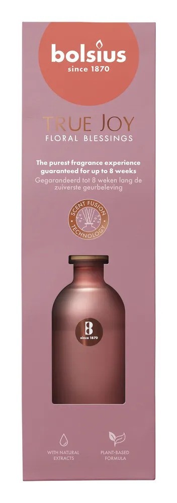 Bolsius True Joy Fragrance Diffuser 80 ml – Floral Blessings, lilleline aroom. Värskenda oma kodu looduse värskusega Bolsius True Joy Botanic Freshness 80 ml lõhnadifuuseriga. Klaaspudel ja puidust pulgad tagavad ühtlase lõhna leviku, mis loob puhta ja rahustava atmosfääri igas toas.