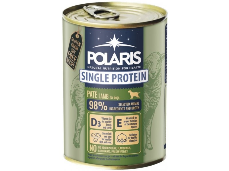 Polaris single protein pate lamb 400g. Täistoit koertele ühe loomse valguallikaga-lambalihaga.Sobib igat tõugu normaalse aktiivsusega koertele