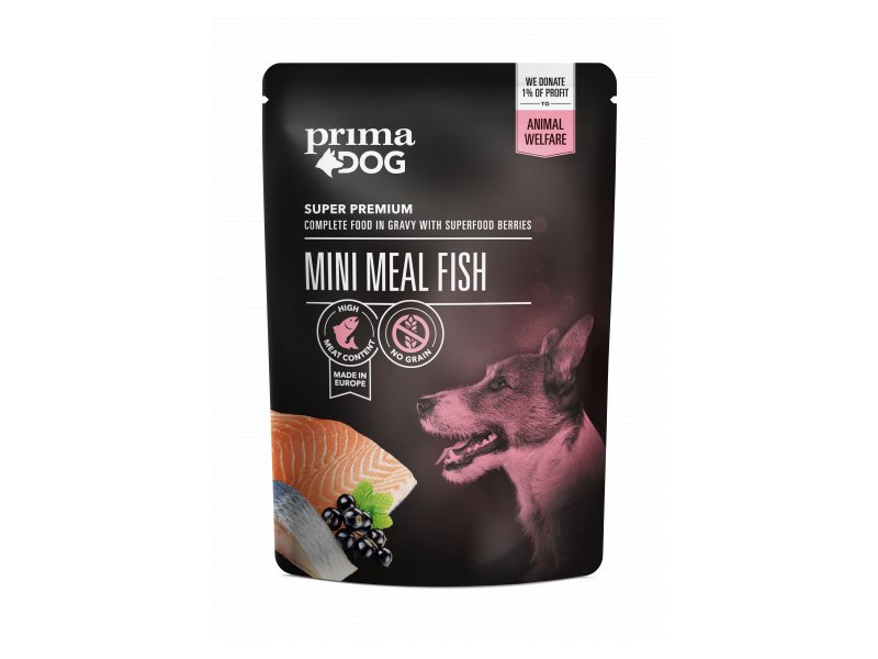 PrimaDog Mini Meal kala kastmes on hõrgult mahlane teraviljavaba koerte märgtoit, mille väike pakend ja sobiva suurusega kalaribad vastavad eriti hästi väikeste koerte vajadustele. Käepärasest kotikesest saad hõlpsasti anda ka suurema koera kuivtoidule kalamaitselist lisa. Lisaks saad Mini Meal märgtoitu kasutada motiveeriva preemiana või reisile kaasa võtta, sest toode säilib avamata pakendis toatemperatuuril. Mini Meal kala kastmes on koeratoit, mille ainus loomse valgu allikas on kala. Kuna portsjoniroog on täiesti teraviljavaba ja sisaldab liha asemel ainult kala, võib see hästi sobida tundliku maoga, allergia nähtudega ja teravilja suhtes tundlike koerte menüüsse. Suus sulava lõhe ja heeringa on maitsekombinatsioon, mis meeldib ka kõige valivale koerale. Kalas sisalduvad oomega-3-rasvhapped on kasulikud koera närvisüsteemile, südamele ja ajule. Lisaks leidub heeringas rikkalikult D-vitamiini, mis tugevdab luid ja hambaid. Täistoidule lisatud supertoidud, mustsõstar, nelk, kurkum ja rosmariin kujutavad endast looduslikke vitamiinide, mikroelementide ja antioksüdantide allikaid, mis toetavad koera üldist heaolu. Märgtoidus sisalduvad biotiin ja tsink toidavad nii koera karvkatet kui ka küüsi ning tauriin soodustab rasvlahustuvate vitamiinide tõhusat imendumist. PrimaDog Mini Meal ei sisalda kunstlikke lõhna-, maitse- ja säilitusaineid.