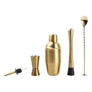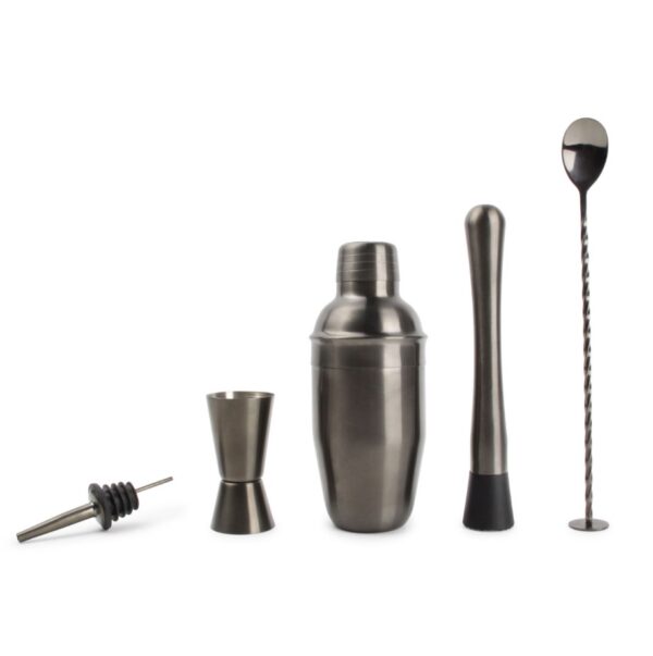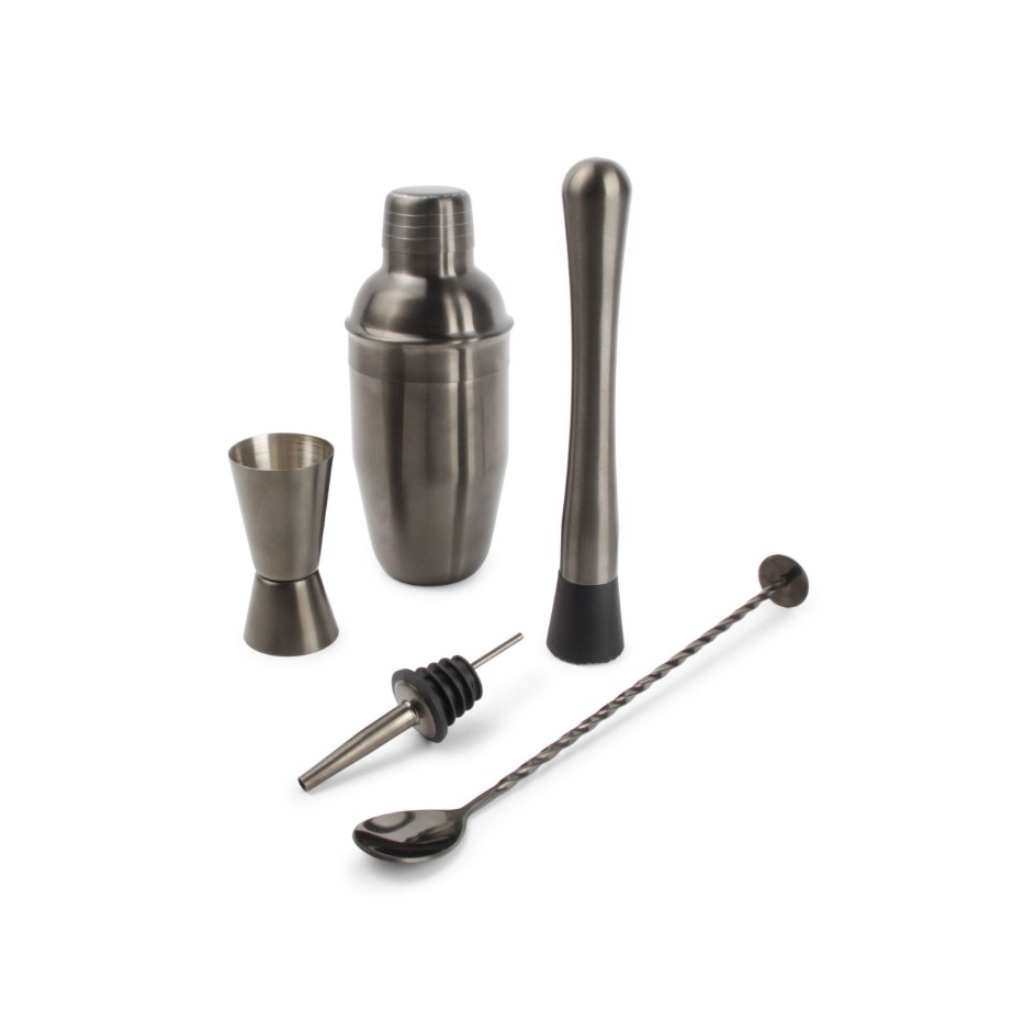 Kokteili valmistamise komplekt koosneb: 1 kokteilišeiker, 1 kokteililusikas, 1 mensuur 2,5/5 cl, 1 uhmer ja 3 valamise tila.