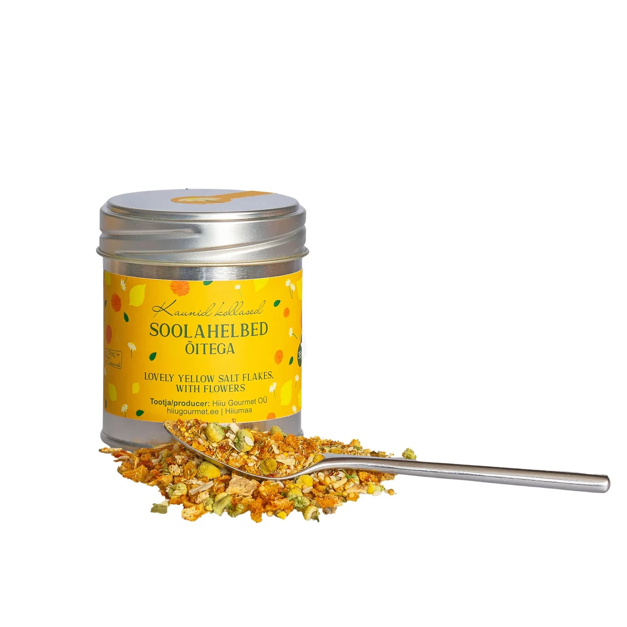 Toitudele saab lisada värvi ja maitset kaunite kollaste soolahelvestega. Segu on maitsestatud sidruniga ning rikastatud seesamiseemnete, sinepiseemnete, ürtide ja õitega. Erksalt kollane ja aromaatne soolasegu sobib suurepäraselt salatite, köögiviljade, liha- ja kalaroogade maitsestamiseks või kaunistuseks, et muuta igapäevane eine erilisemaks.
