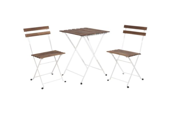 Valge metallraamiga ja akaatsia puiduga aiamööblikomplekt Bistroo on ilmastikukindel ning seda saab integreerida igale terrassile, rõdule või aeda. Aiakomplekt koosneb lauast ja kahest toolist ning on ideaalne söögilaua alternatiiv väiksesse korterisse või kohtadesse, kus ruum on piiratud. Tänu kvaliteetsetele materjalidele sobib Bistroo nii sise- kui ka välistingimustes kasutamiseks.