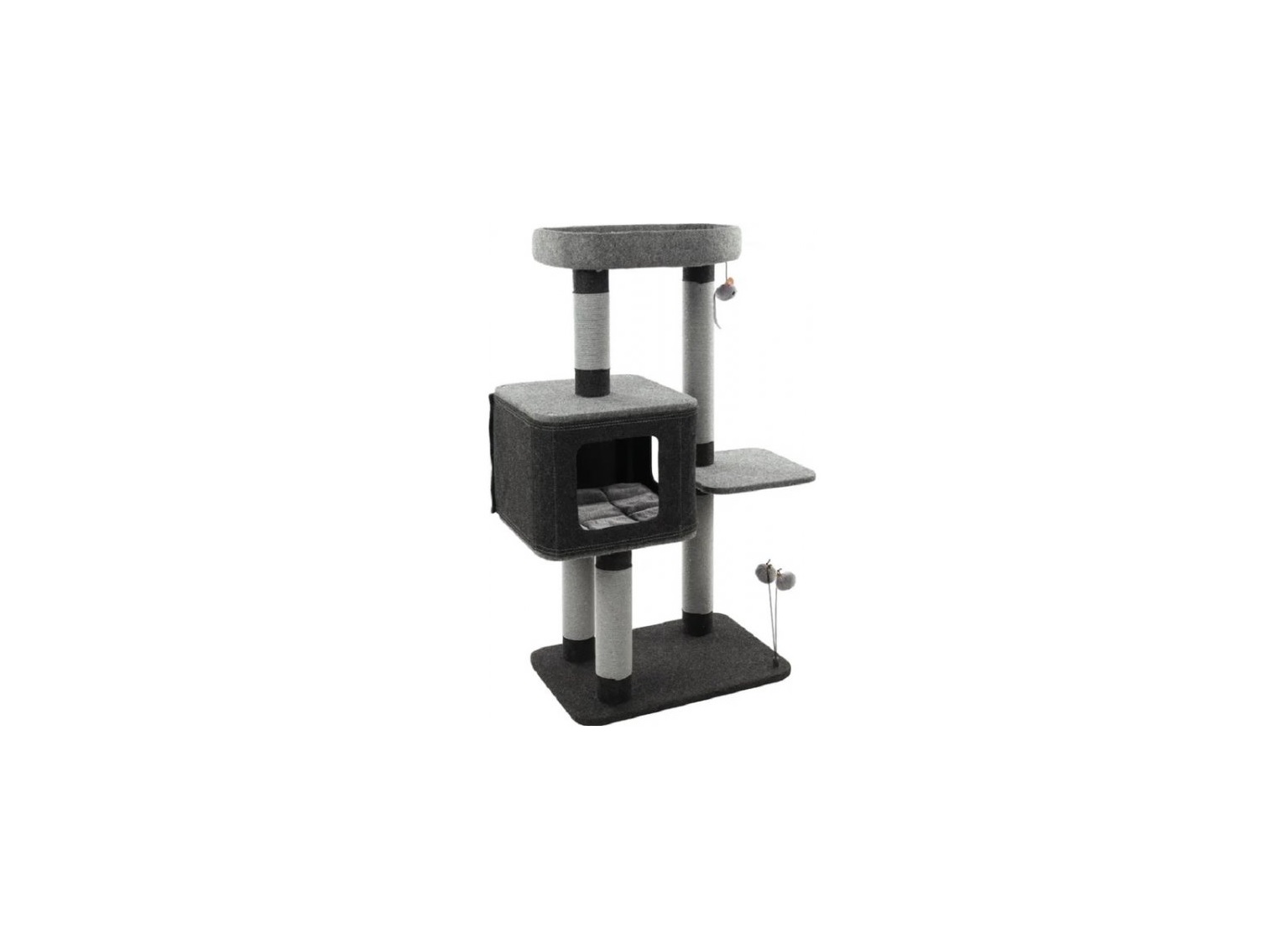 Flamingo Fati kraapimispuu on stiilsetes hallides värvides, kahe tasandiga ning mänguasjadega. Kraapimispuule on kinnitatud 5 meetrit nööri, torude läbimõõt on ca 8,5cm. Eraldi magamisosa võimaldab kassil segamatult puhata. Kraapimispuu on kaetud pehme materjaliga ning magamisosa katted on eemaldatavad ja pestavad 30 kraadiga.
