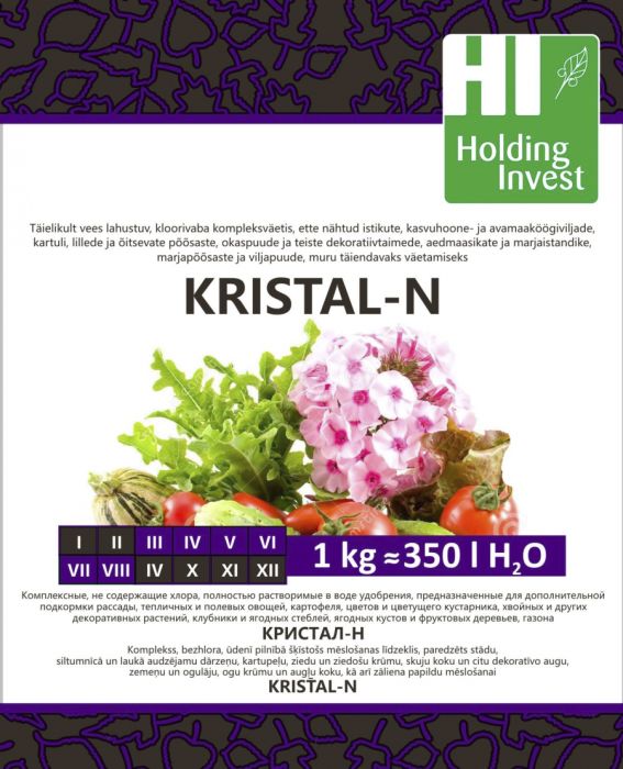 Kristal-N on kloorivaba, täielikult vees lahustuv kompleksväetis, mis sobib laiale valikule taimedele. Ideaalne lahusväetamine kasvuhoone- ja avamaakultuuride, puude, põõsaste ning dekoratiivtaimede täiendavaks toitmiseks.