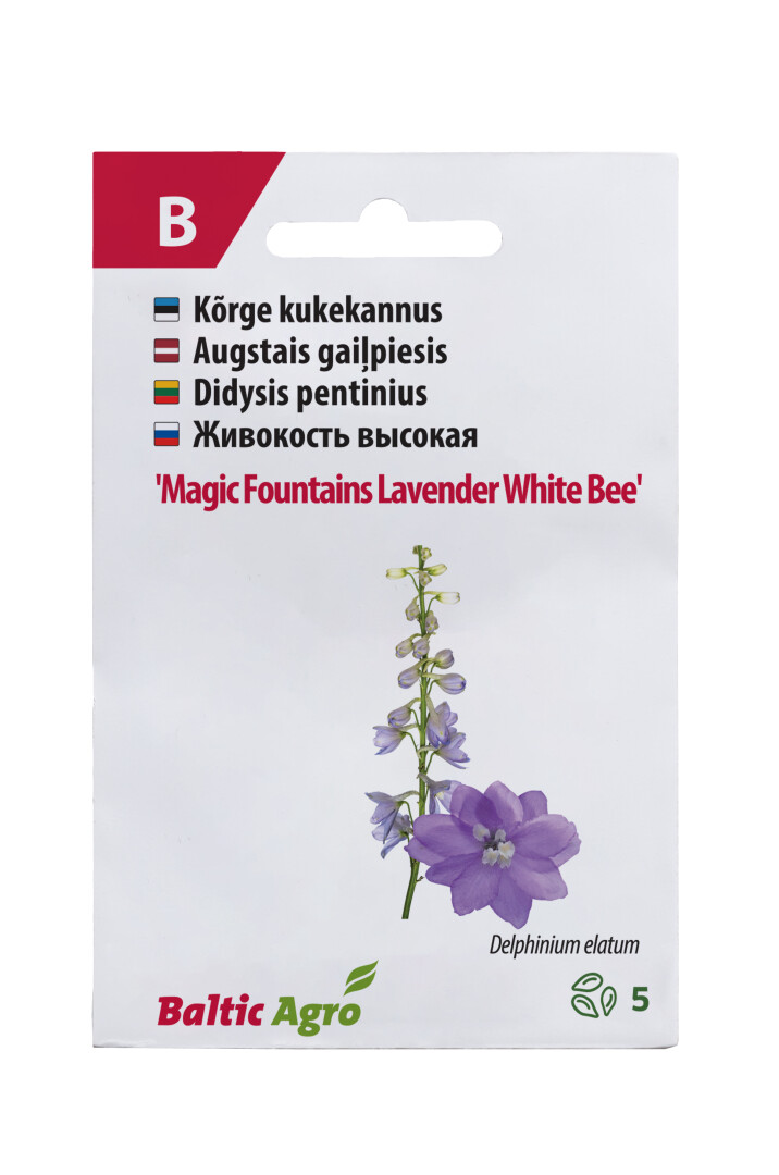 Kukekannus on elegantne ja kõrgekasvuline püsilill, mille ‘Magic Fountains Lavender White Bee’ sordi lavendlillad õied valge südamikuga toovad peenrasse pehme ja romantilise värvitooni. Taim kasvab umbes 100 cm kõrguseks ning sobib suurepäraselt ka lõikelilleks, sest õisikud on kaunid ja püsivad vaasis hästi. Tootepilt on illustratiivne.