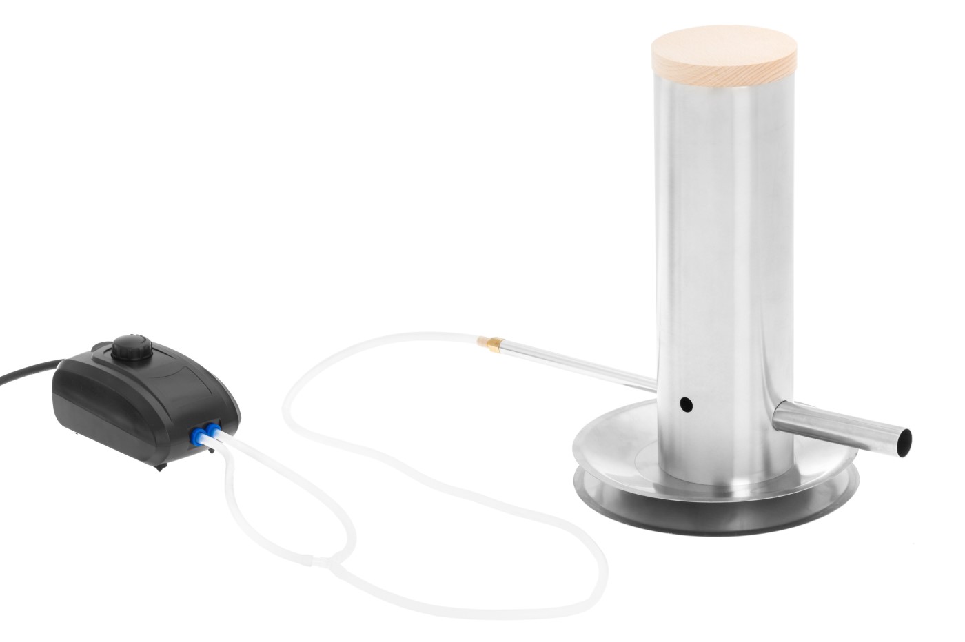 Puidust kaas, suitsutoruga silinder ja messingliitmik, 2 terasest alust, konks, siipmuter, ilmapump, Y-liitmik ja voolik.