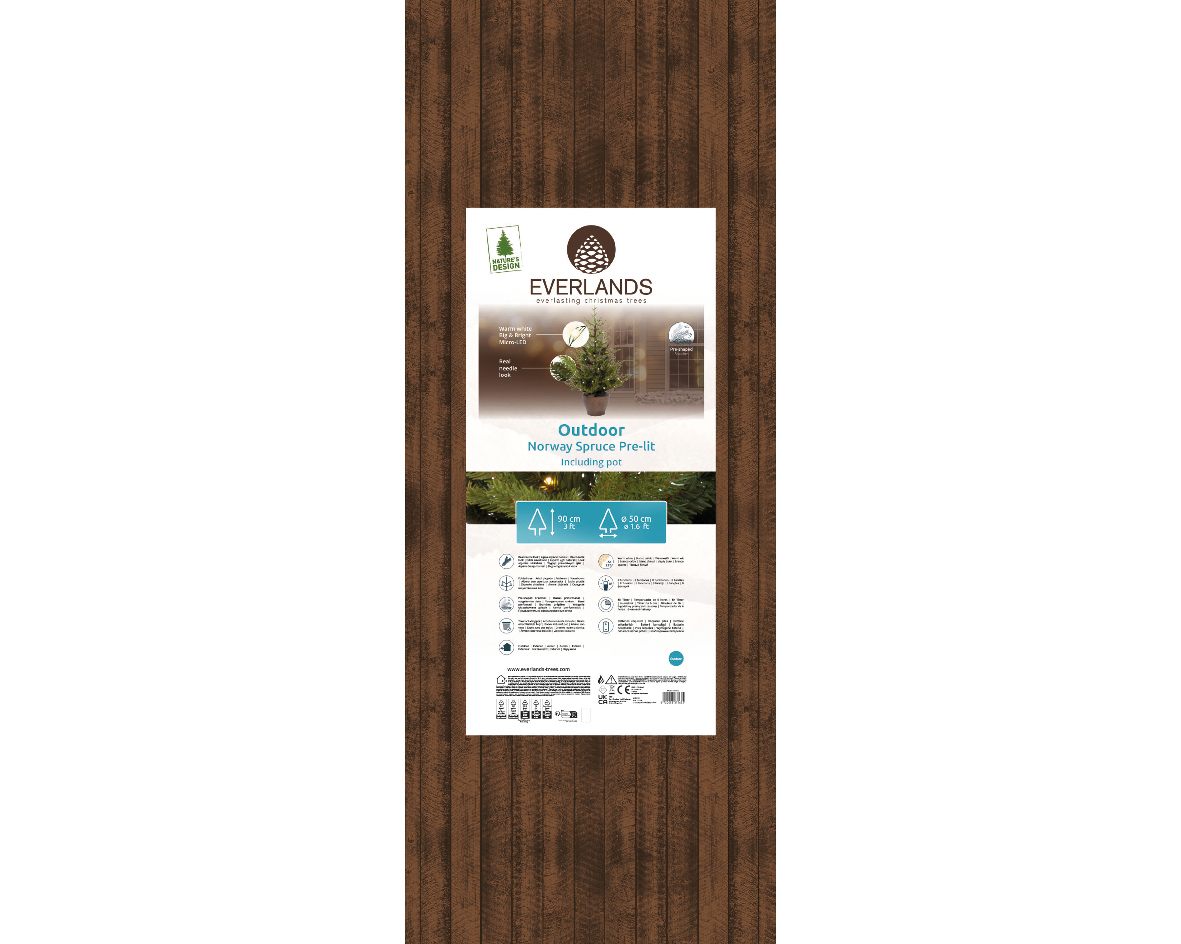 Kuusk on paigutatud ümara pruuni potti, mis tagab stabiilsuse. Oksi kaunistavad 60 sooja valget LED-tuld, mis on ühtlaselt jaotatud rohelisele juhtmele. Valgusketil on 8 funktsiooniga vilkuv efekt ning mugav taimer (6 tundi sees, 18 tundi väljas).