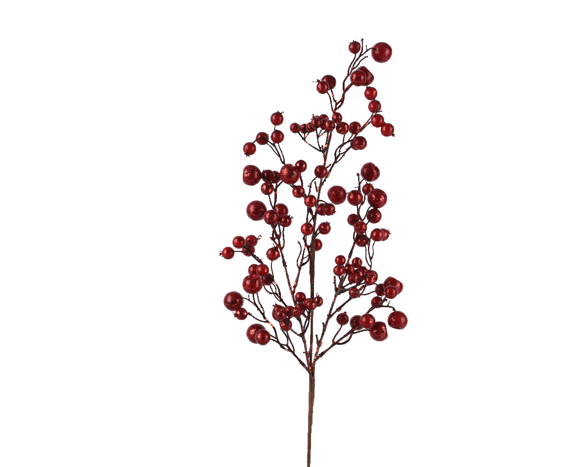 Kunstoks punaste sädelevate marjadega. Silmapaistev ja pidulik detail, mis sobib hästi vaasi, pärgadesse või teiste dekoratsioonide täienduseks.