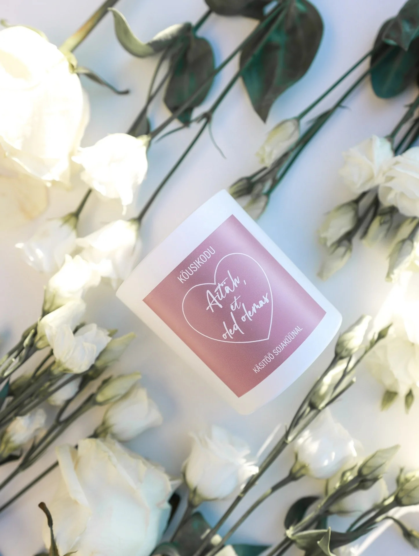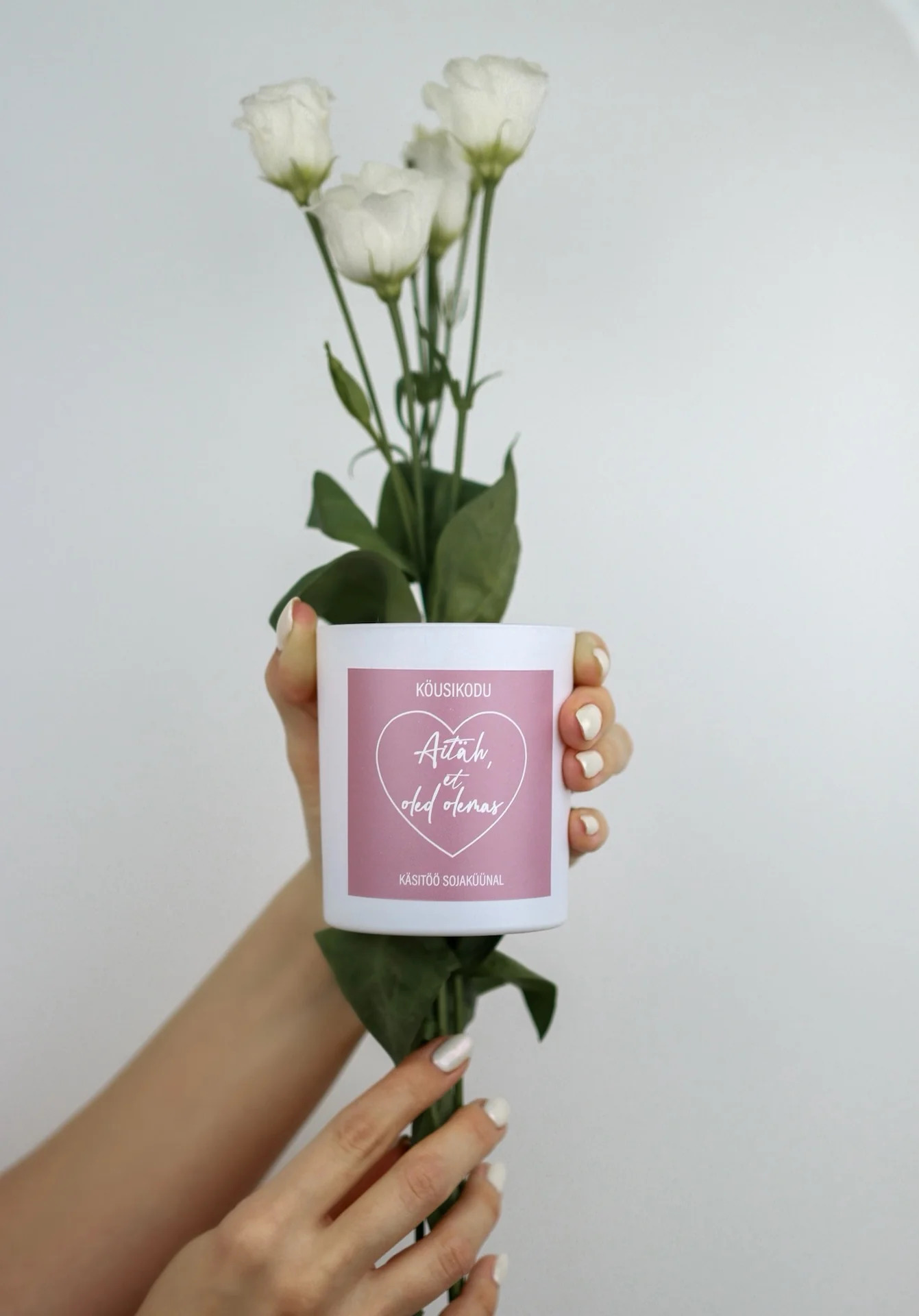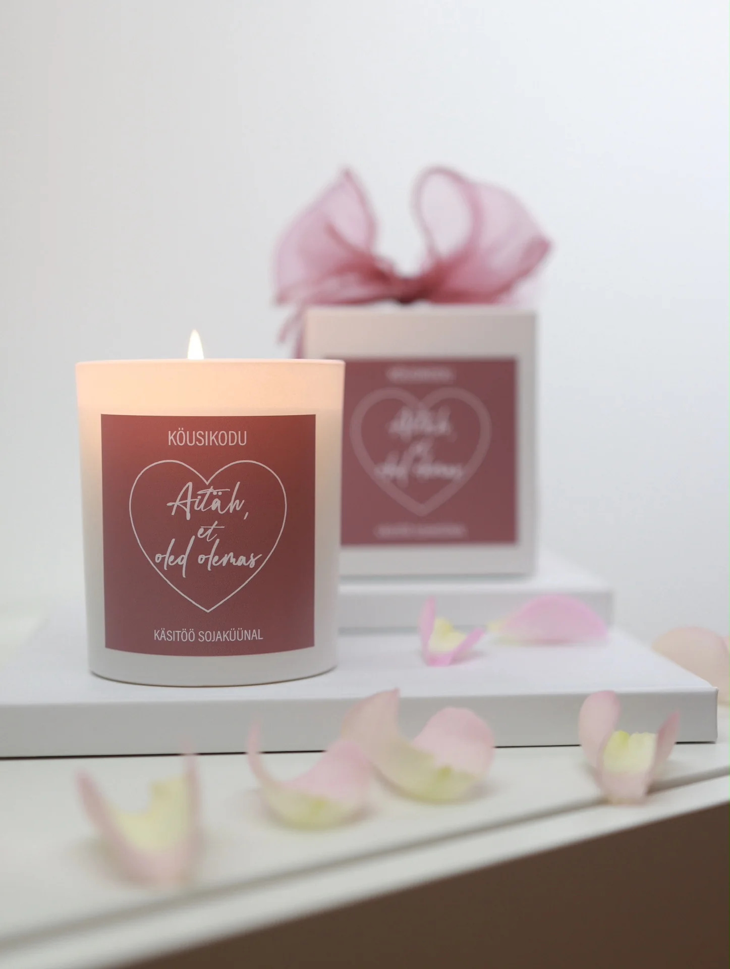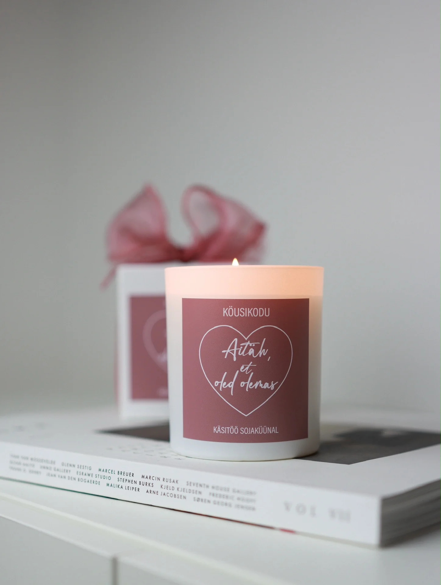 Küünal “Aitäh, et oled olemas” (40–50 tundi) – sõnumiga lõhnaküünal karbis. 100% naturaalsest sojavahast valmistatud küünal on rikastatud kõrgkvaliteetsete lõhnaõlidega, mis on IFRA sertifitseeritud. See tagab küünla ohutu ja tervisesõbraliku kasutamise.