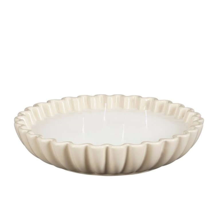 Lillekujuliselt vormitud servaga keraamilises kausis küünal, mille reljeefne pind ja hele toon annavad sellele pilkupüüdva, kuid rahuliku ilme. Suurem läbimõõt muudab selle efektseks dekoratiivseks detailiks nii lauale, riiulile kui ka aknalauale.