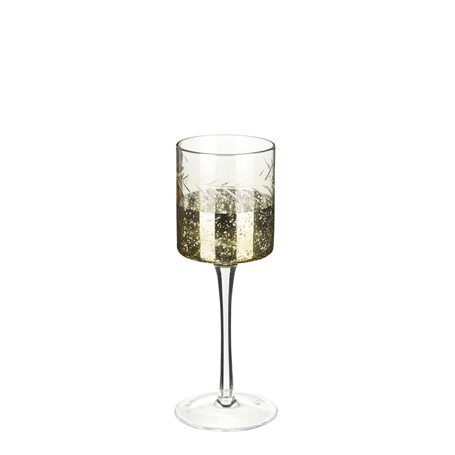 Õhuline ja elegantne klaasist küünlahoidja, mille sihvakas jalg ja kuldse viimistlusega ülaosa loovad mulje pokaalist. Läbikumav pind on kaunistatud peente graveeringute ja sädelevate detailidega, mis toovad küünlaleegi sära eriliselt esile. Sobib suurepäraselt pühadeks, romantilisteks õhtuteks või peolauda kaunistama.