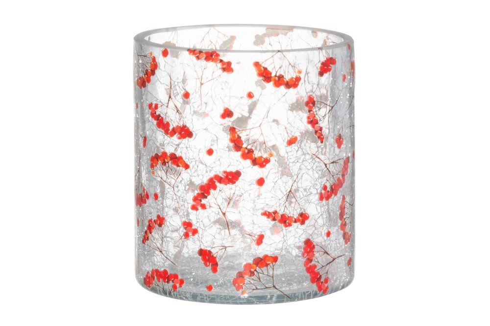 Läbipaistvast klaasist küünlahoidja on kaunistatud õrnade pihlakaokste mustriga ja kaetud efektse pragulise pinnaviimistlusega. Süüdatud küünla valgus kumab läbi klaasi, luues hubase ja kauni valgusemängu, mis toob interjööri looduslähedast meeleolu. Hoidjat saab kasutada ka väikese vaasina – sobib hästi loodusest korjatud okste, seemnekuprate või kuivatatud lillede esitlemiseks. Mitmekülgne ja dekoratiivne ese, mis täiendab nii kodu kui ka hooajalisi kaunistusi.