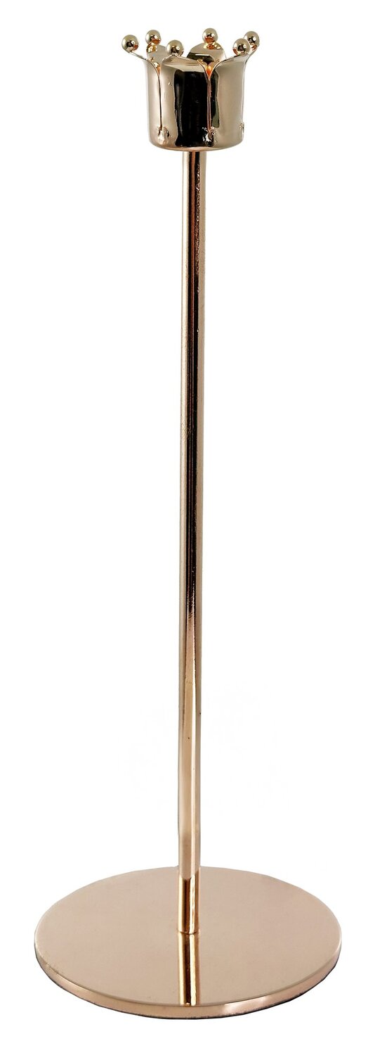 Metallist küünlajalg kuldse kroonikujulise alusega. Kõrge ja sihvakas vorm loob mulje graatsilisest elegantsist, samas kui läikiv viimistlus lisab interjöörile pidulikkust. Sobib pidulikele laudadele ja väärikateks detailideks igapäevasesse dekoori.