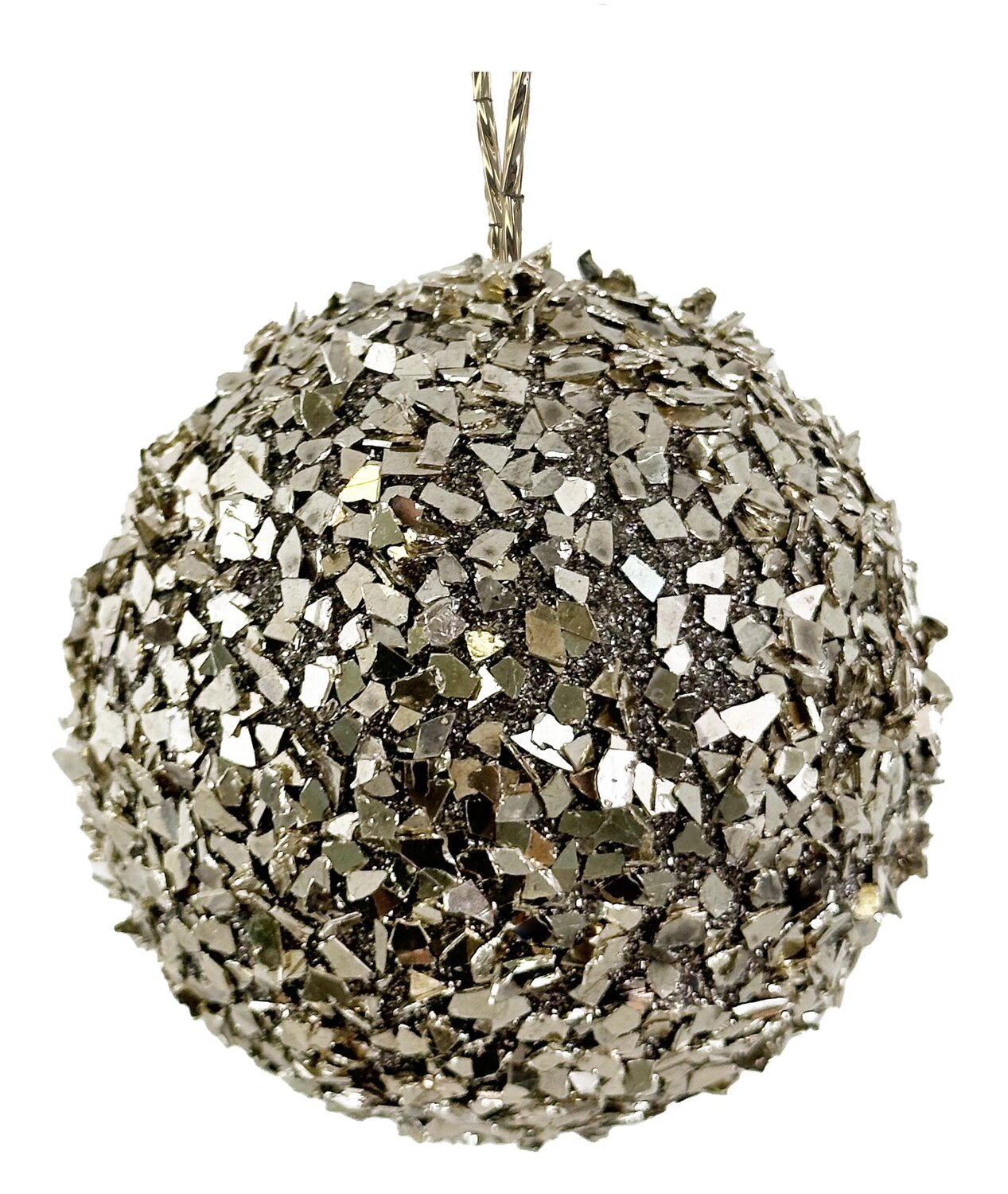 Särav kuuseehe, mille pind on tihedalt kaetud ebakorrapäraste hõbedaste helvestega. Ehte pind püüab valgust igast suunast, luues sädeleva ja mitmetahulise efekti, mis sobib eriti hästi valguskettide kõrvale. Ehe on kerge ja vastupidav – lihtne paigutada nii kuusele kui dekoratiivsetesse kompositsioonidesse.