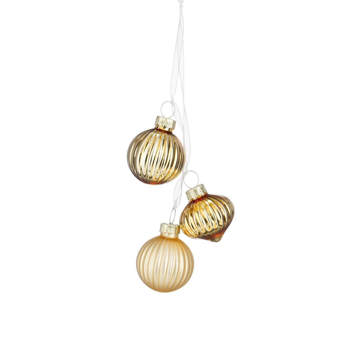 Kuldse tooniga klaasist kuuseehete komplekt, mis koosneb kolmest erineva kujuga elemendist. Läbikumav ja sooneline pind annab ehetele kerge sära ja õrna struktuuri. Toob kaunistusse soojust ja harmooniat.
