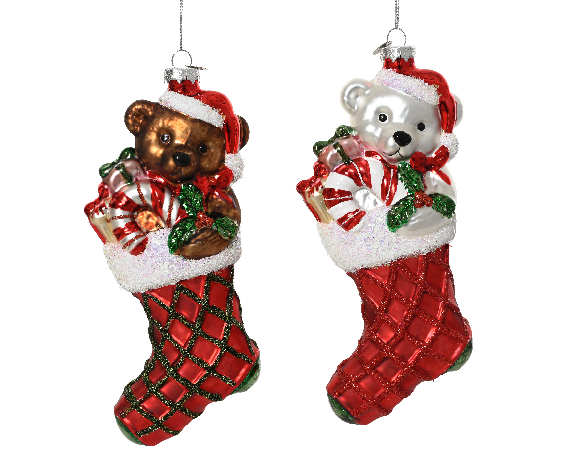 Klaasist kuuseehe, millel on punane jõulusokk ja selles armas karukujuke koos kingitustega. Detailne ja särav disain loob kuusel sooja ja piduliku meeleolu.