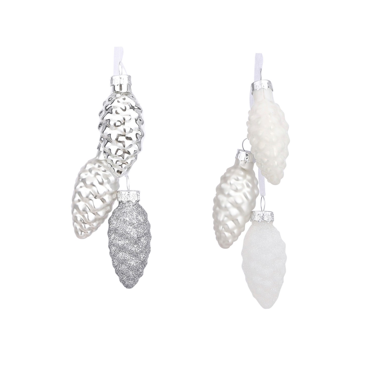 Klaaskäbide komplekt kahes elegantses toonis – valge ja hõbedane. Komplektis on kolm erineva viimistlusega ehet: matt, läikiv ja glitter, mis esinevad mõlemas värvitoonis. Helge ja jaheda tonaalsusega ehted sobivad ideaalselt põhjamaise või klassikalise stiiliga kuusele.