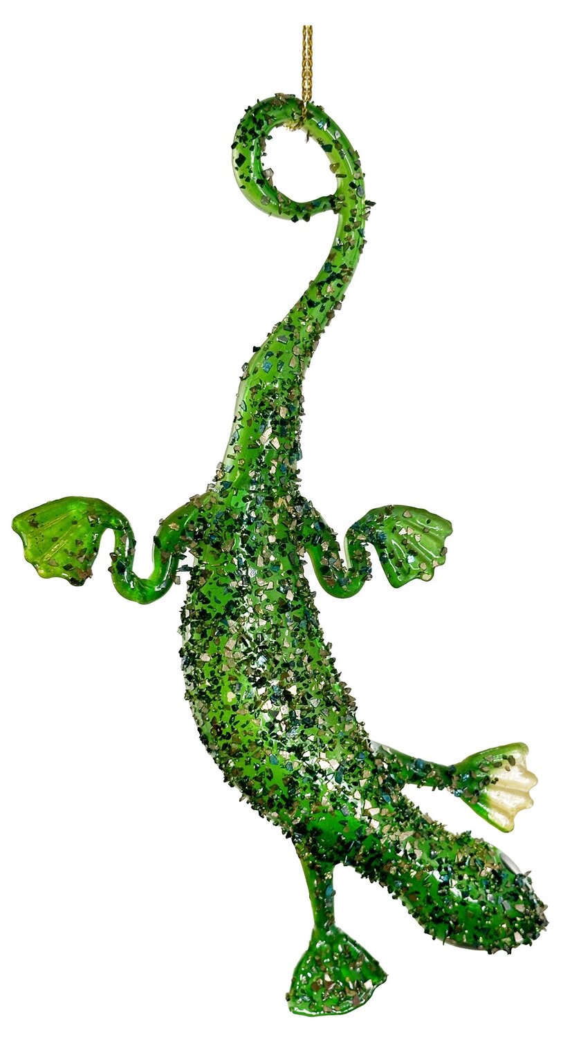 Vahva klaasist kuuseehe rohelise sädeleva sisaliku kujul. Omanäoline disain koos kõvera saba ja liikuva hoiakuga toob kuusele mängulisust ning ootamatust. Glitterdetailid lisavad sära ja loovad valguses elava, kütkestava pinna.