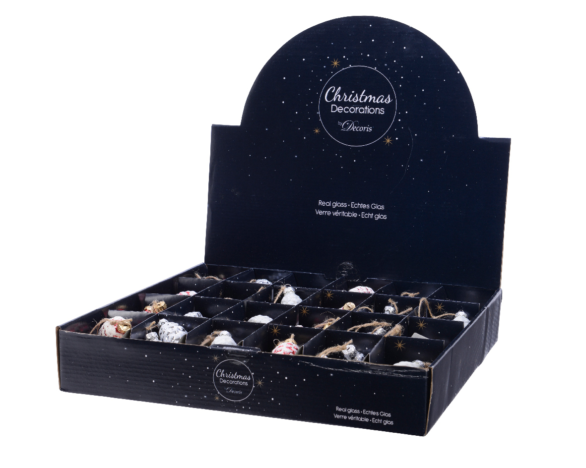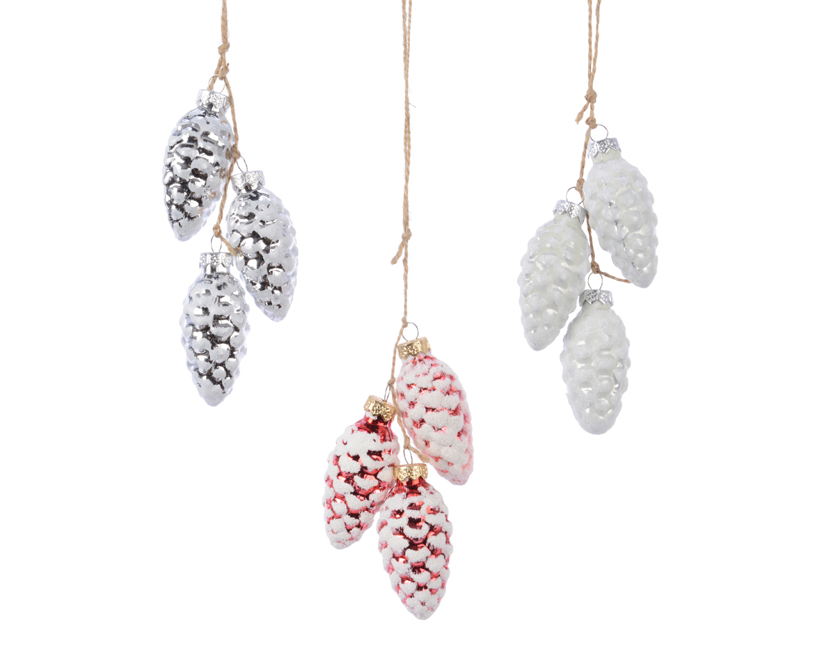 • Materjal: klaas. • Mõõdud: 6cm • Komplektis 3 käbi. • Valikus erinevad värvid: 1. Hõbedased käbid. 2. Punased käbid. 3. Valged käbid.