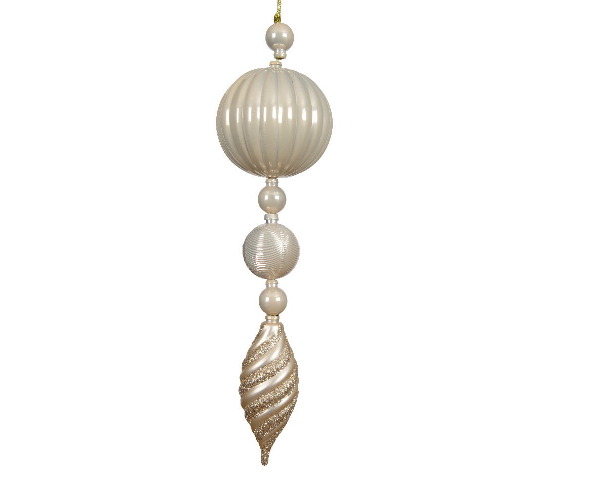 Pilkupüüdev kuuseehe, mis lisab jõulupuule luksuslikku sära. Kreemjas rippuv ornament koosneb erinevatest vormidest – ümaratest helmestest ja spiraalviimistlusega tilgast. Matt ja pärlilaadne pind koos kuldse sädelusega loob piduliku ja harmoonilise üldilme.