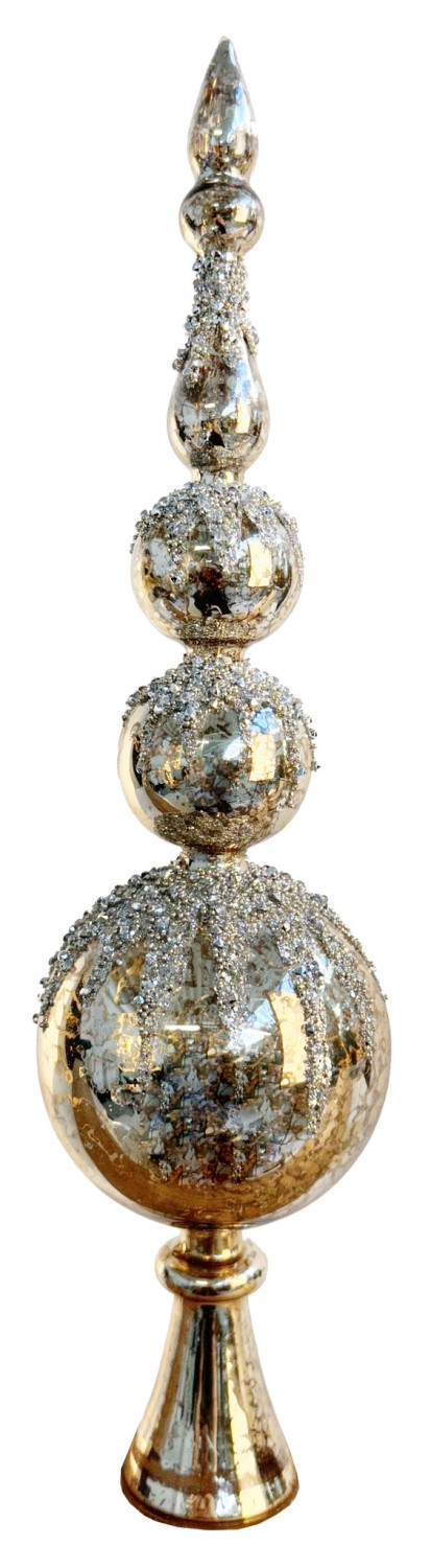 Majesteetliku vormi ja vanaaegse sädelusega kuusetipp, mis kroonib jõulupuu pilkupüüdva elegantsiga. Peegeldav klaaspind koos säravate pärlidetailide ja glitteriga loob luksusliku tulemuse, mis toob kuuse kaunistusele dramaatilise keskpunkti.