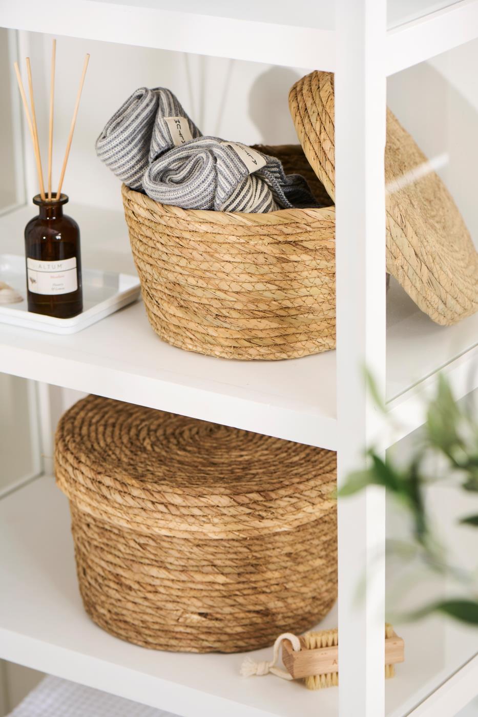 Dekoratiivne ja praktiline käsitsi punutud mereheinakorv, millel on sobiva kujuga kaas. Sobib suurepäraselt väiksemate esemete hoidmiseks esikus, vannitoas või riiulil – lisades ruumile loomulikku tekstuuri ja soojust.