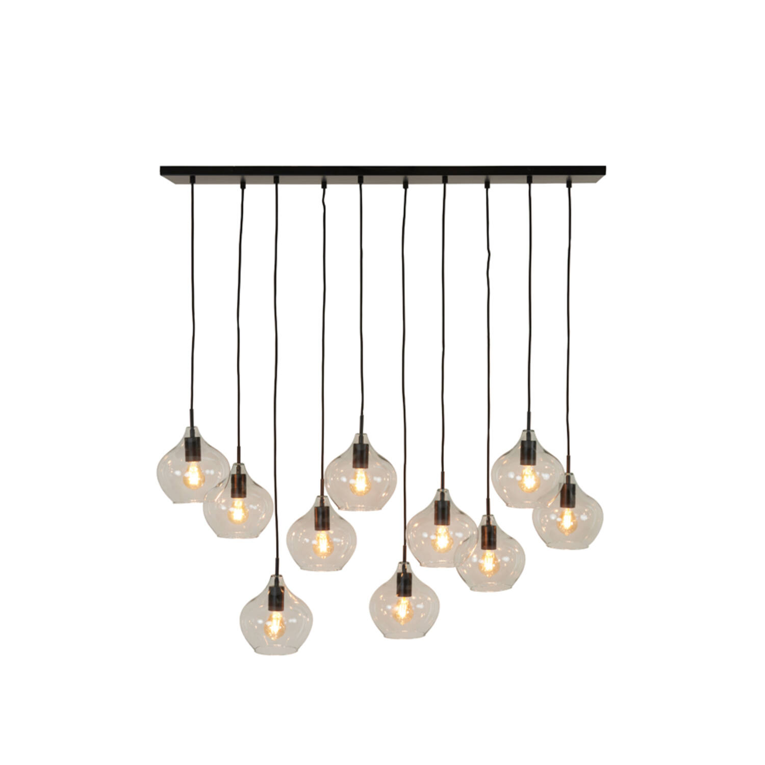 Materjal: raud, klaas Tulede arv: 10 Lambipesa suurus: E27 Laius: 35cm Pikkus: 124cm Kõrgus: 60cm Värvus: must