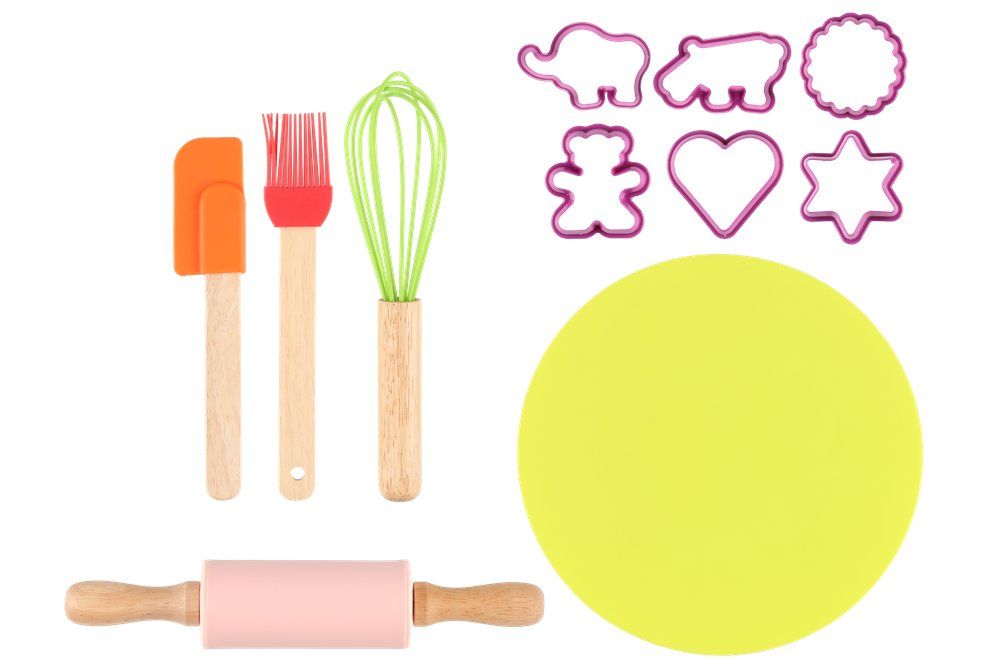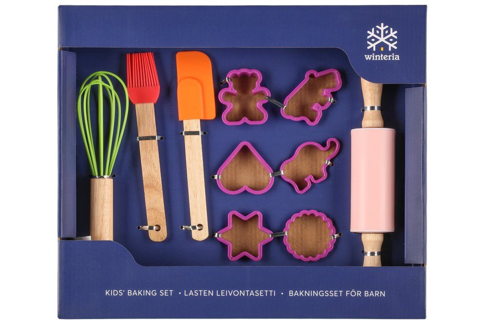 Imeliselt värviline küpsetuskomplekt sisaldab: spaatlit, silikoonpintslit, visplit, taignarulli, küpsetusmatti, 6 tk küpsisevormi.