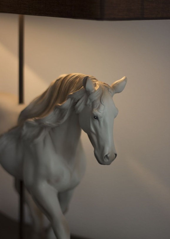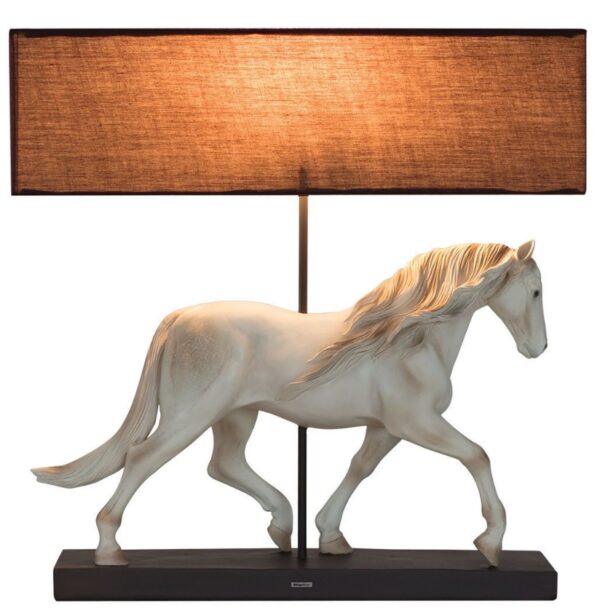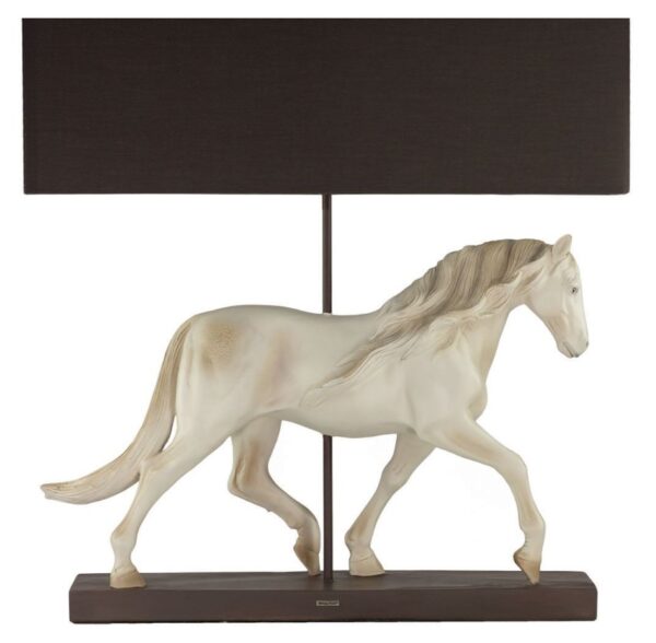 Kaunis hobuselamp tõelisele hobusesõbrale. See suur beež hispaania hobune tuleb oma pruuni põhja ja lambivarju tõttu kaunilt esile.