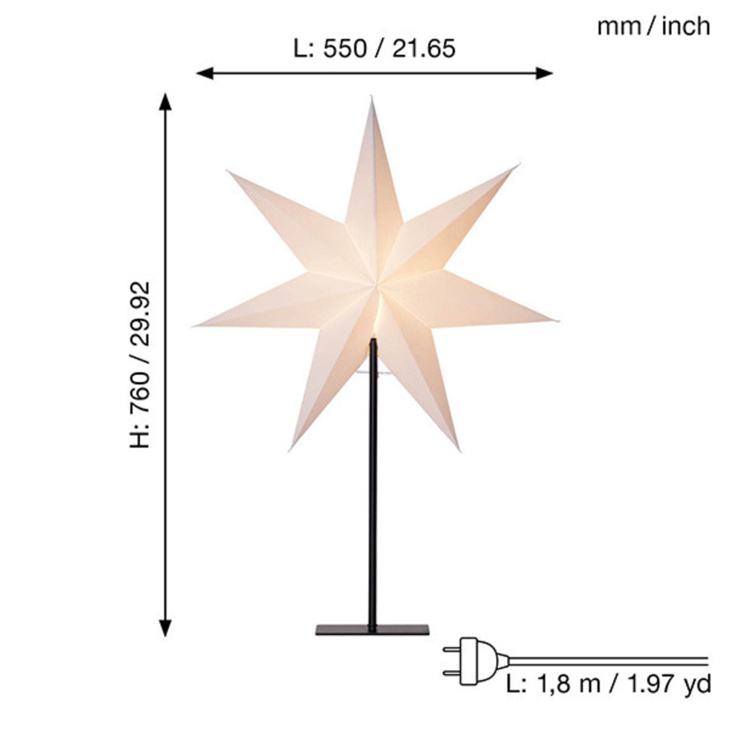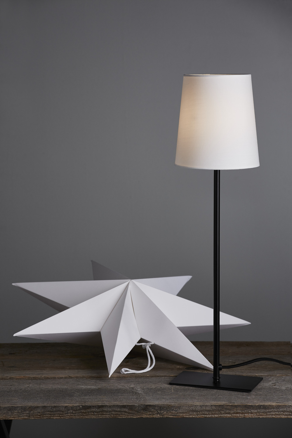 Nutikas kaheosaline lauavalgusti ühendab endas jõuluaja dekoratiivse tähe ning aastaringseks kasutamiseks sobiva klassikalise lambivarju. Komplektis on valge paberist 7-haruline täht ja neutraalne koonuskujuline varjuosa, mida saab vastavalt hooajale vahetada. Must metallist jalg annab valgustile elegantse ja stabiilse põhja ning sobitub hästi erinevatesse interjööridesse.