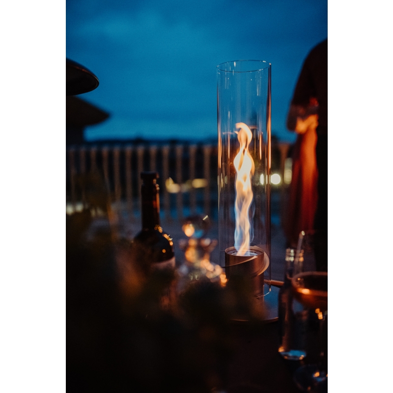 Höfats SPIN lauatuli – dekoratiivses klaasist silindris keerleb elav tuli, mis toob lõkkeõhtu atmosfääri sinu rõdule või terrassile.