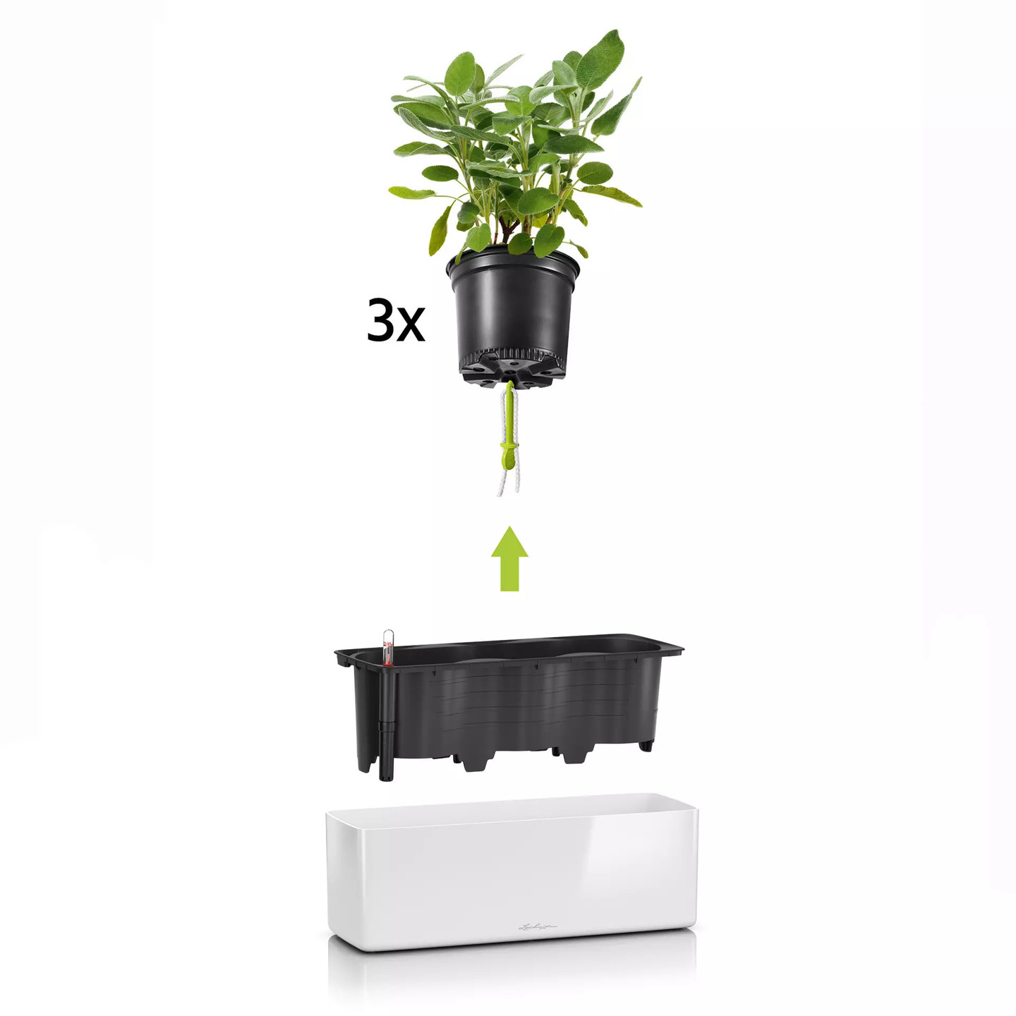 Pika ja kitsama kujuga pott sobib suurepäraselt maitsetaimede kasvatamiseks köögis, sukulentide kompositsiooniks riiulil või efektseks lauakaunistuseks õitsvate taimedega. Integreeritud niisutuspulga süsteem koos 1-liitrise veereservuaariga tagab taimedele püsiva niiskuse ja vähendab kastmise sagedust. Taimi saab kasutada koos poe kasvupottidega (Ø 10–12 cm), ilma ümber istutamata.
