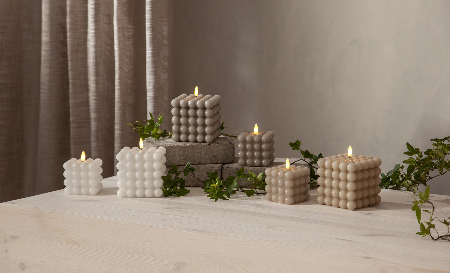 Valgest vahast valmistatud ruudukujuline LED-küünal, mille pind on kaetud mullitaolise reljeefiga. Flamme Dot küünal sobib suurepäraselt nii üksikuna kui ka koos teiste sarja toodetega – loob dekoratiivse ja hubase üldmulje. Soe valge valgus ja tõetruu leek teevad sellest ohutu, kuid visuaalselt pilkupüüdva alternatiivi päris küünlale. Sisseehitatud taimer lülitab küünla iga päev automaatselt sisse 6 tunniks ja välja 18 tunniks.
