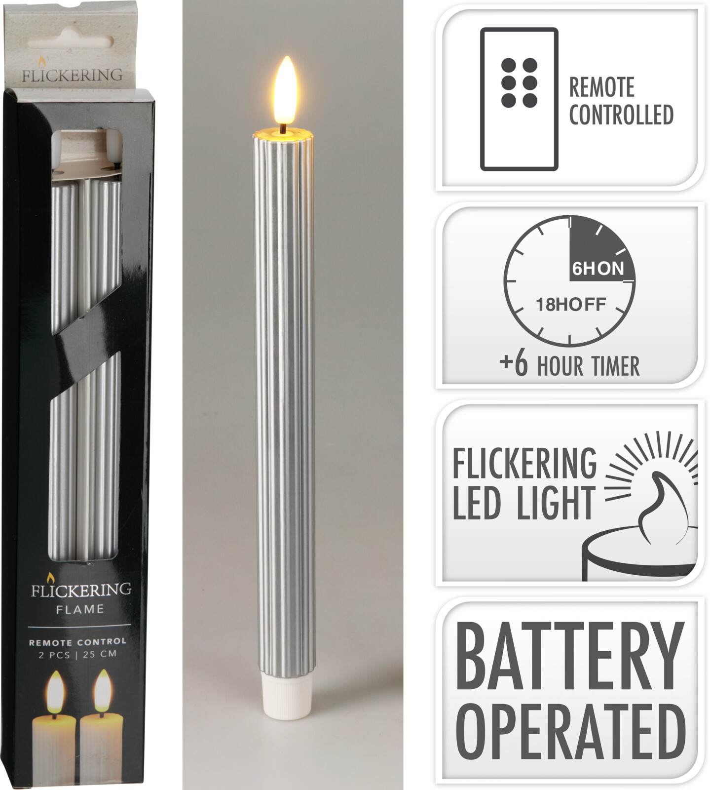 Kaks patareitoitel LED-küünalt, millel on hõbedane värvus ja vertikaalsete triipudega pind. Küünaldel on laineline ülaosa ning need on varustatud mugava lüliti ja kaugjuhtimispuldiga, millega saab valida sisse/välja lülitamise ja taimerrežiimi.