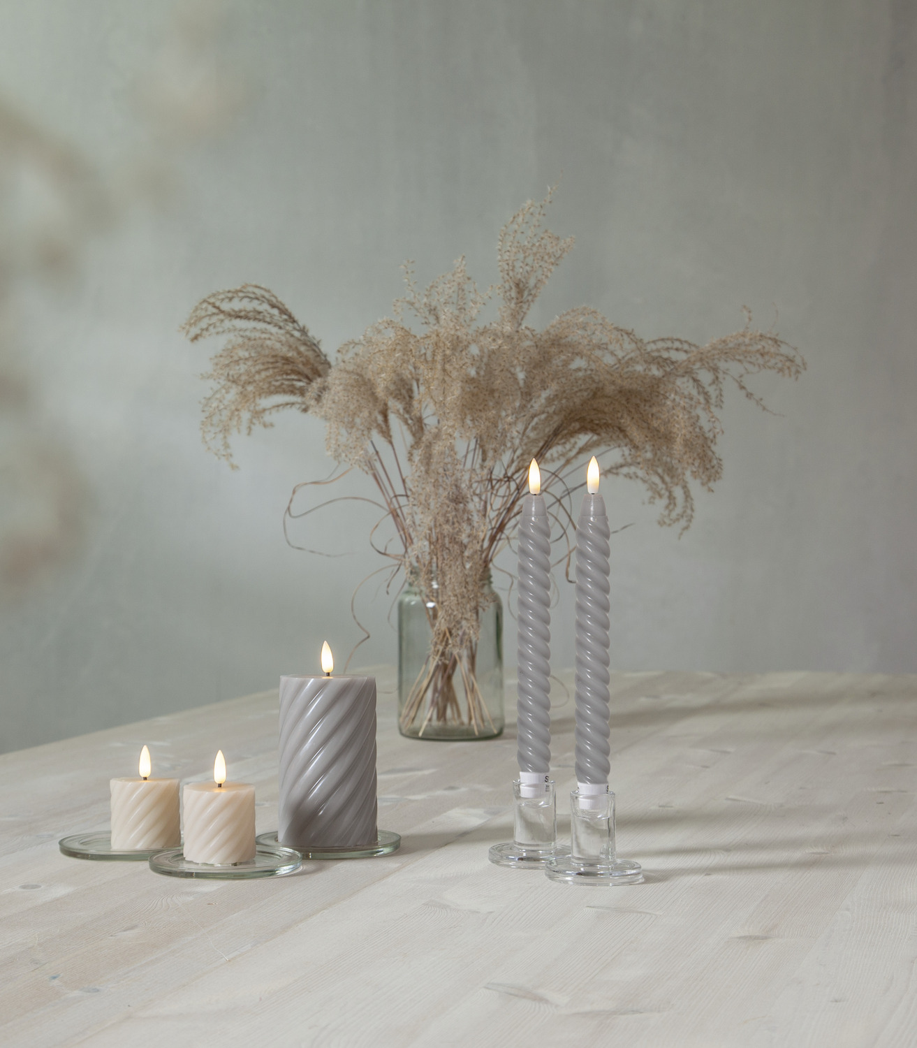 Kaks kõrget LED-küünalt, millel on spiraalse reljeefiga pind ja naturaalset küünlaleeki imiteeriv soe valgus. Küünlad kuuluvad Flamme sarja ning sobivad kasutamiseks tavalistes küünlajalgades. Küünla aluses on silikoonkattega jalg, mis aitab küünlal hoidjas stabiilselt püsida. Sisseehitatud taimer lülitab küünlad automaatselt sisse 6 tunniks ning välja 18 tunniks. Ohutu ja mugav lahendus siseruumidesse.